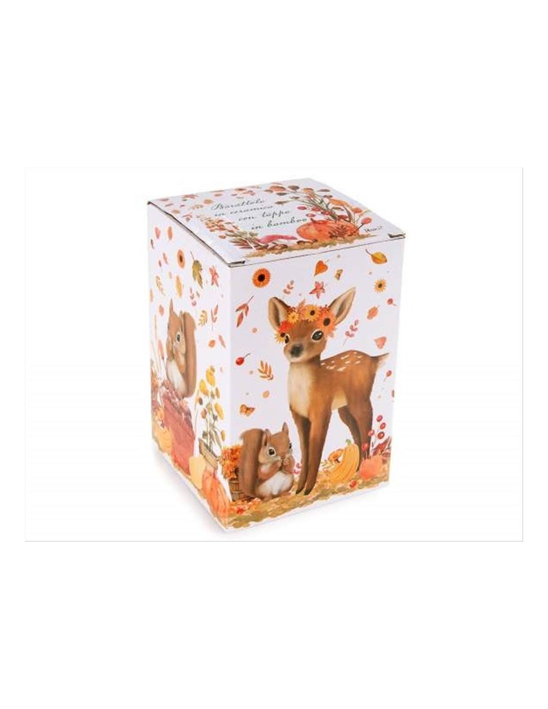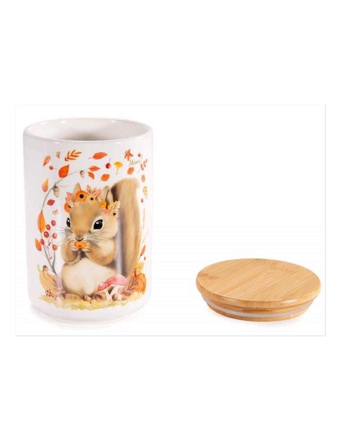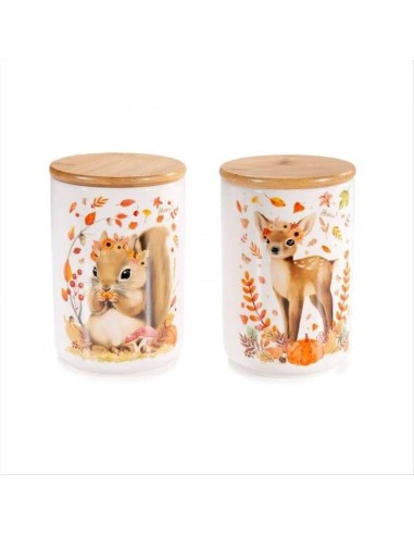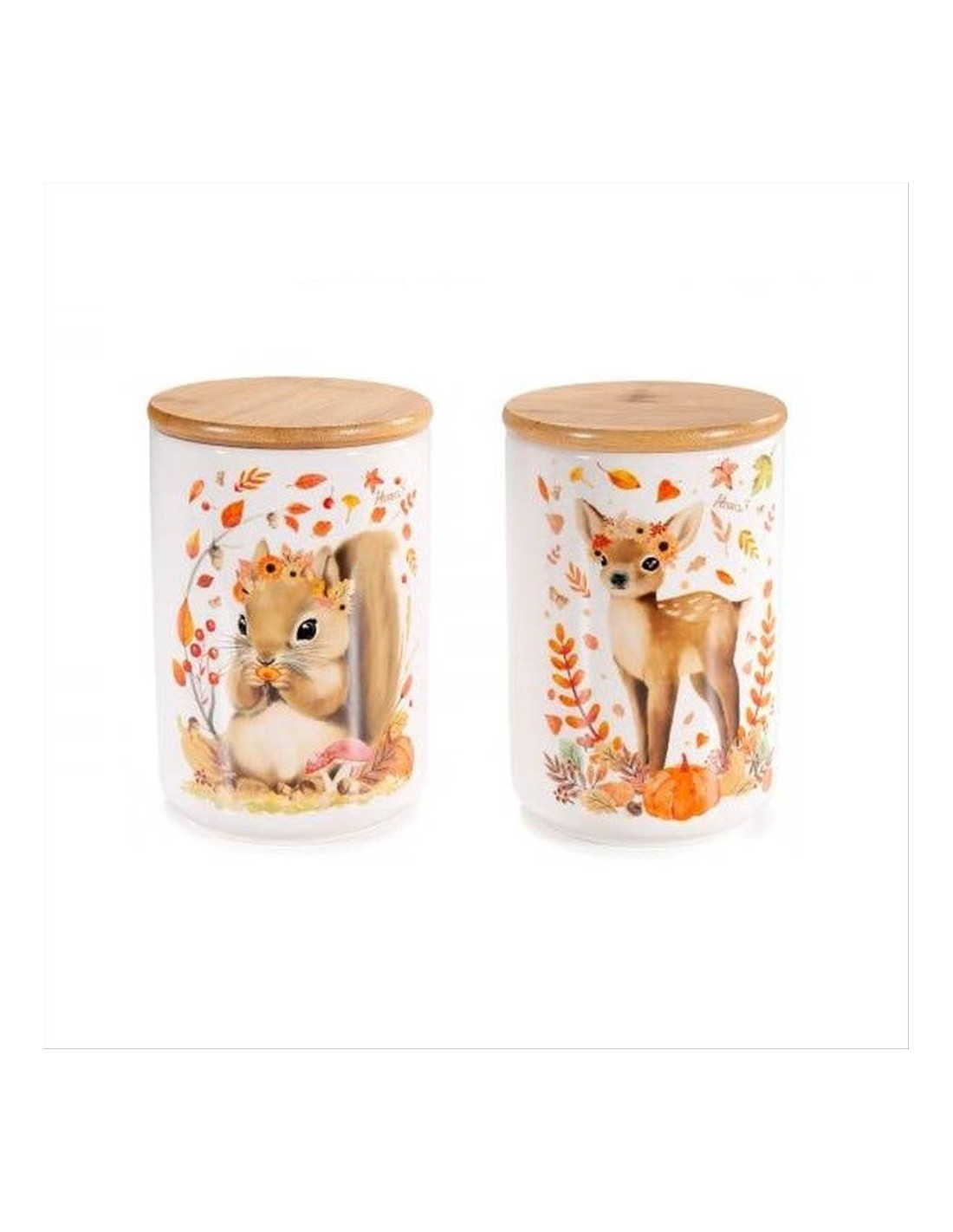Disponibile in 2 fantasie – scoiattolo o cerbiatto – misura Ø 10 x H 15,5 cm ed è dotato di chiusura ermetica con coperchio in bamboo, perfetto per mantenere freschi biscotti, zucchero, tè, caffè o spezie.