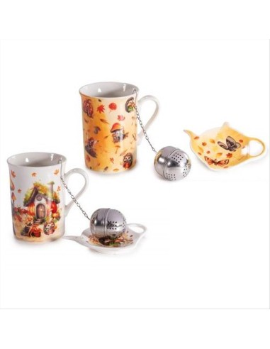 Disponibile in 2 fantasie – una con casetta fatata su base bianca e l’altra con stampe autunnali su base gialla – è completa di filtro in acciaio e piattino a forma di teiera, perfetto come appoggia bustina o per piccoli dolcetti.
