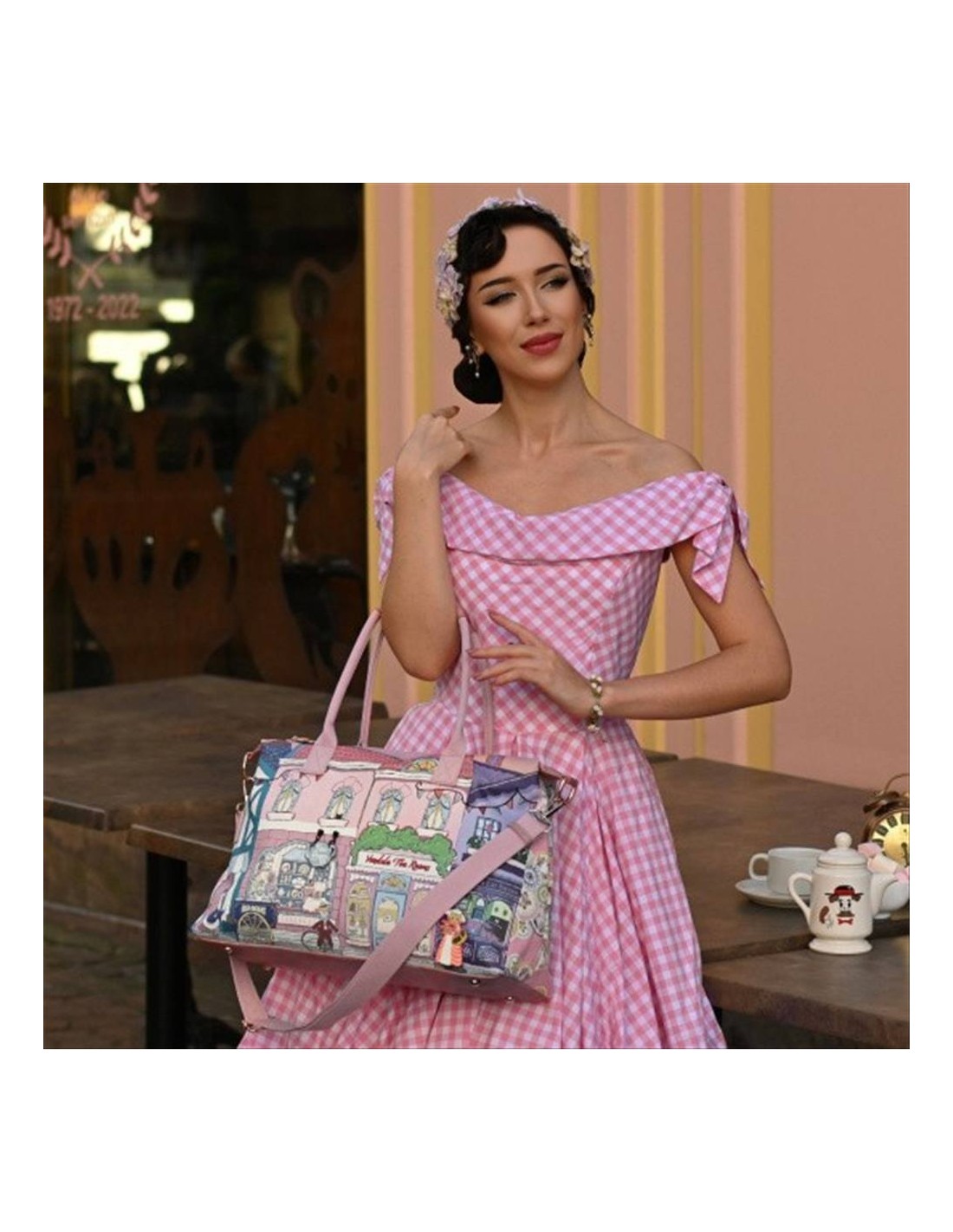 La Borsa Weekender Bonnie Vendula Heritage – Victorian Tea Rooms è un sogno vintage per ogni avventuriera! 🏡✨ Capiente e funzionale, è ideale per viaggi brevi o giornate impegnative. Realizzata in pelle vegana, presenta un'incantevole stampa di una strada vittoriana con dettagli 3D, zip floreali e una fodera esclusiva.