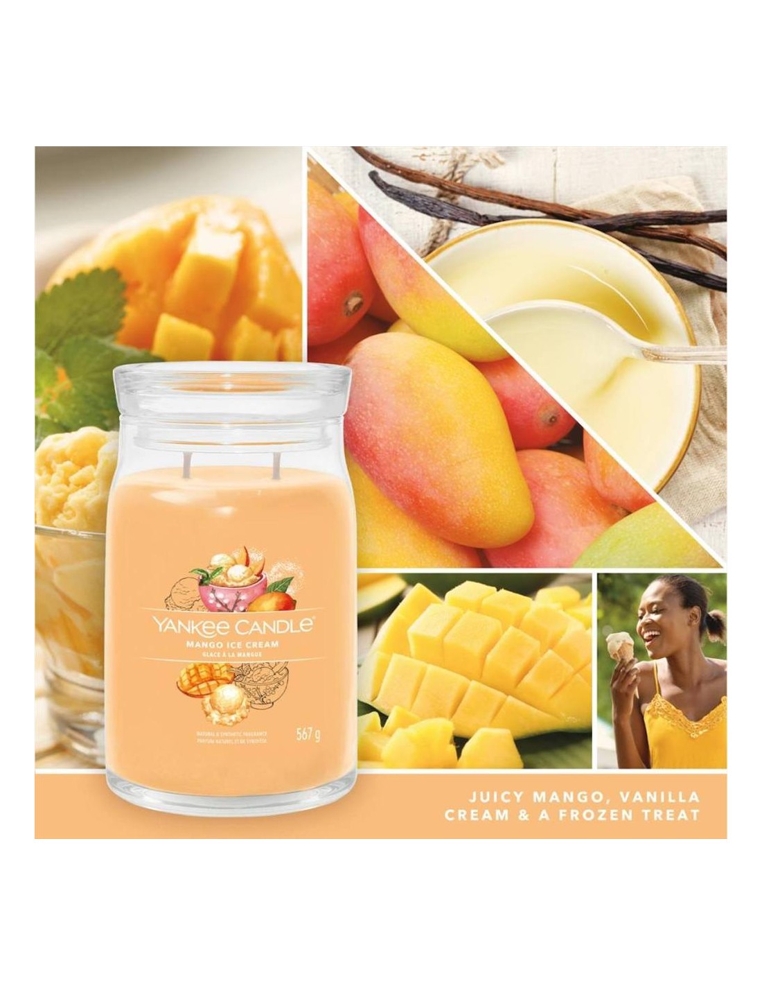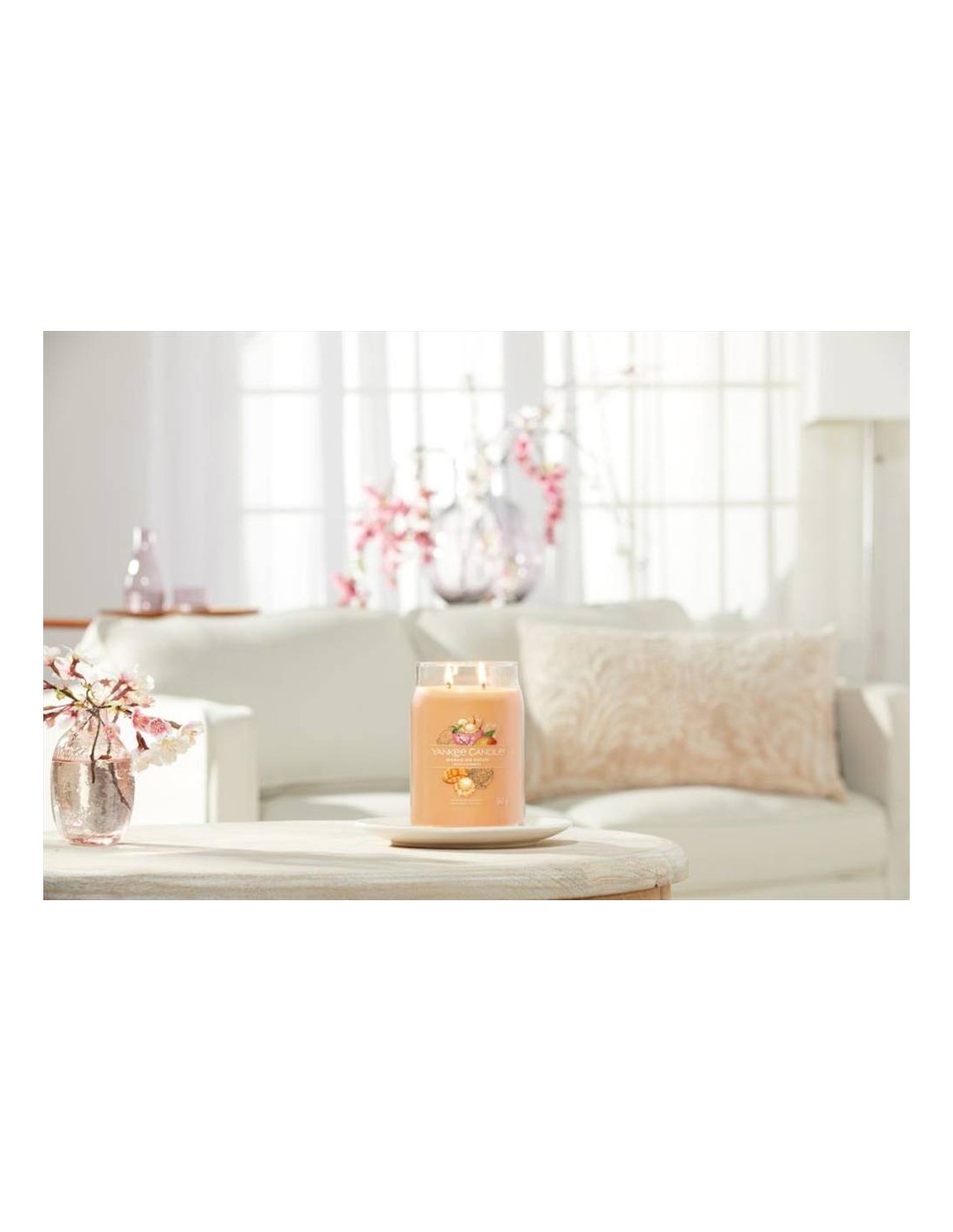 Questa giara grande da 567g diffonde una fragranza dolce e avvolgente, dove il mango maturo incontra la cremosa panna alla vaniglia, arricchita da note fresche di arancia, ananas e bacche succose. Perfetta per creare un’atmosfera calda e invitante, è ideale per gli amanti dei profumi golosi e fruttati. Il design Signature con due stoppini e cera di soia garantisce una combustione pulita e duratura fino a 90 ore. 🍦☀️