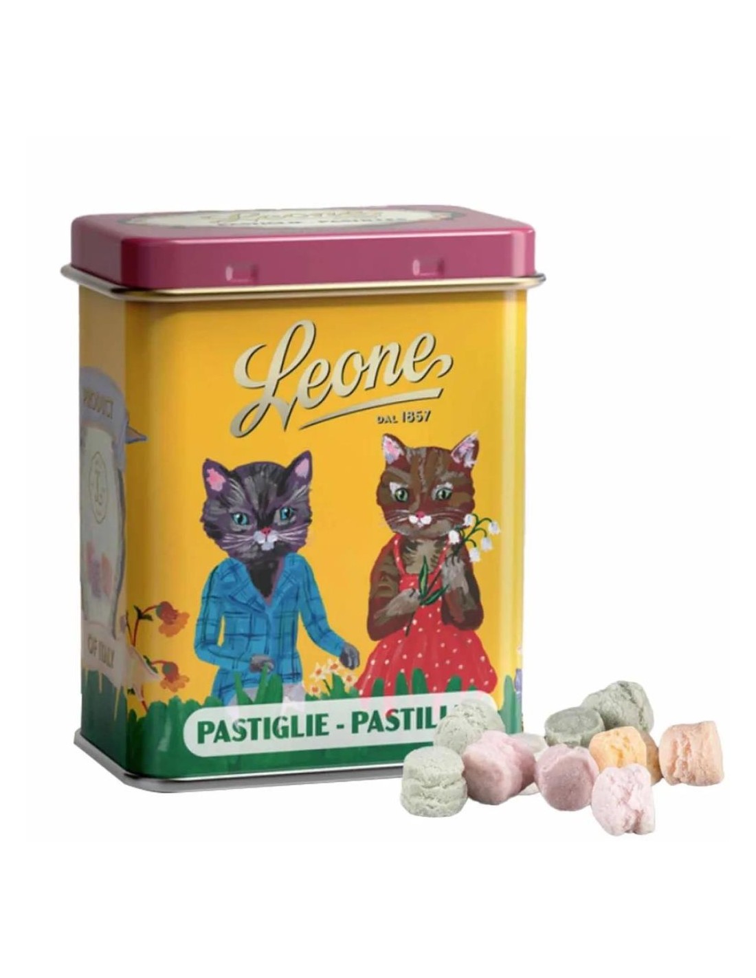 Le Pastiglie Nathalie Lété Pastiglie Leone sono un piccolo capolavoro da collezione: lattine da 30g nei toni giallo, azzurro e rosa, decorate con adorabili micetti illustrati dall’artista francese Nathalie Lété 🎨✨