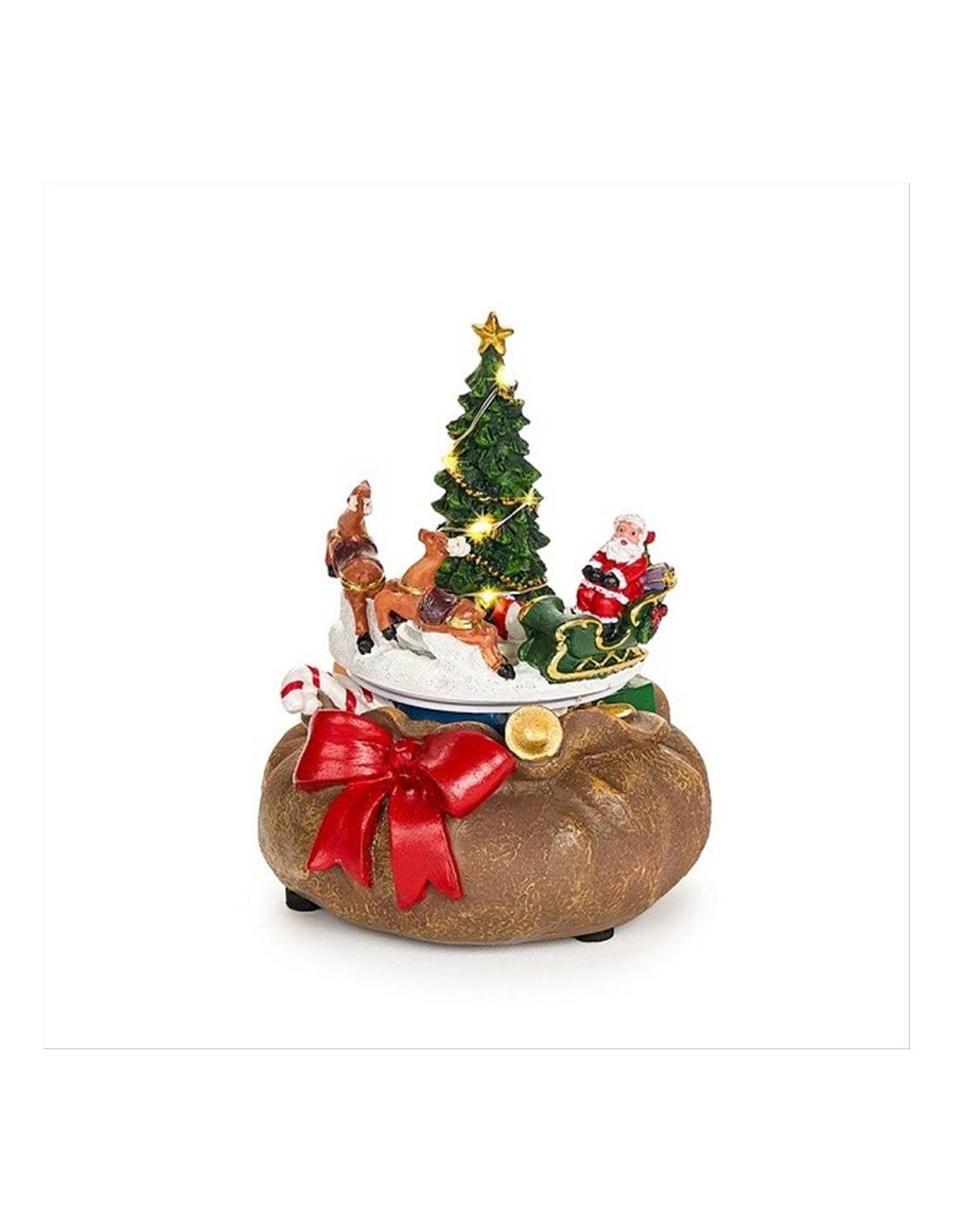 realizzato in resina, presenta una slitta carica di doni e un albero di Natale,