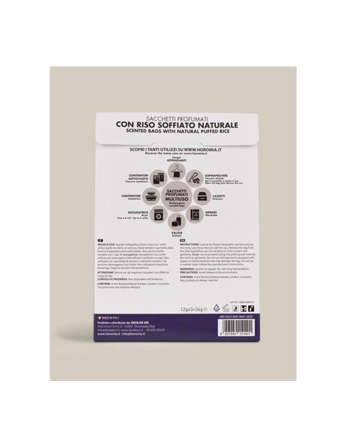 L’unicità e l’intensità delle fragranze Horomia ora in Sacchetti Profumati Multiuso. Creati con riso soffiato naturale non alimentare, i sacchetti profumati Horomia sono formulati per donare ai tuoi capi e alla tua casa il profumo unico e inconfondibile della tua fragranza preferita. Ogni confezione contiene tre sacchetti profumati avvolti in una busta trasparente ad alta protezione, per un profumo intenso e duraturo fino a 12 settimane.
