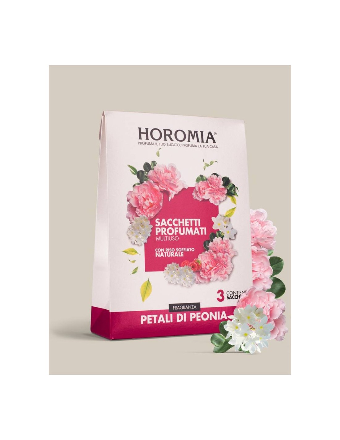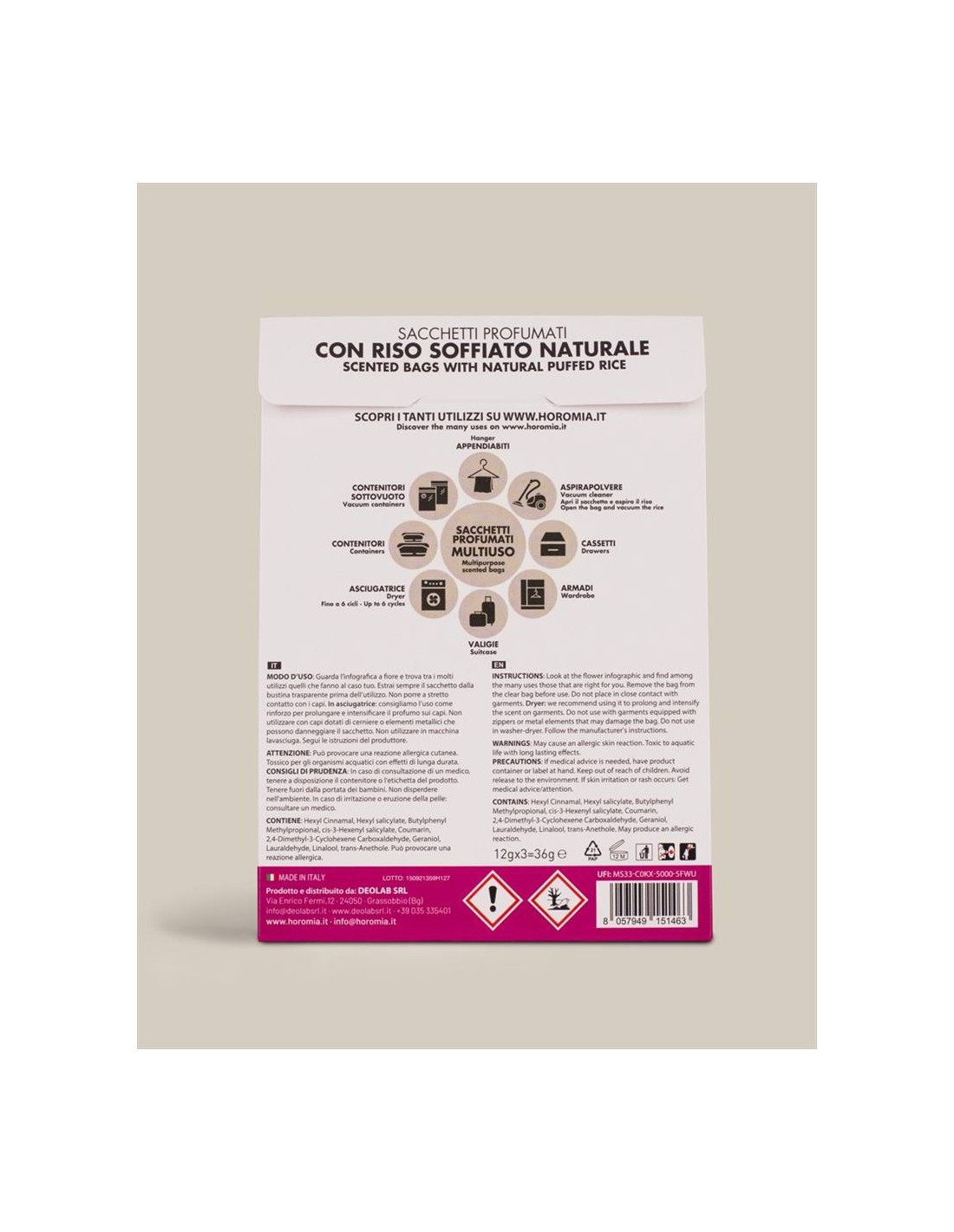 L’unicità e l’intensità delle fragranze Horomia ora in Sacchetti Profumati Multiuso. Creati con riso soffiato naturale non alimentare, i sacchetti profumati Horomia sono formulati per donare ai tuoi capi e alla tua casa il profumo unico e inconfondibile della tua fragranza preferita. Ogni confezione contiene tre sacchetti profumati avvolti in una busta trasparente ad alta protezione, per un profumo intenso e duraturo fino a 12 settimane.