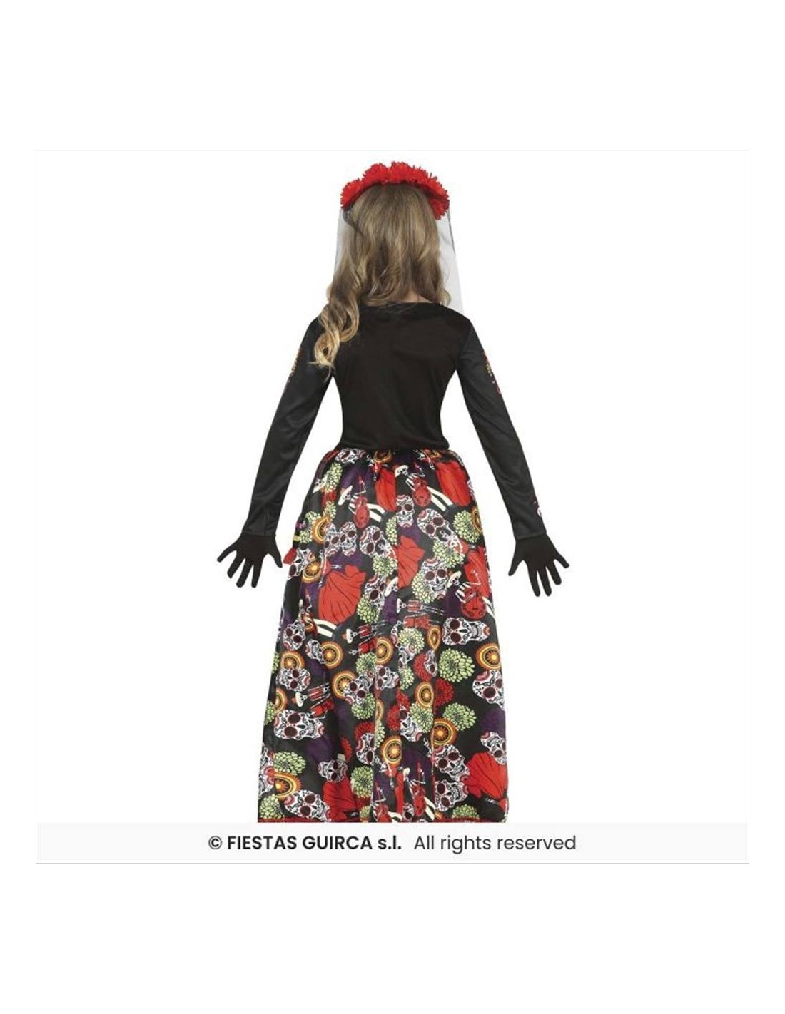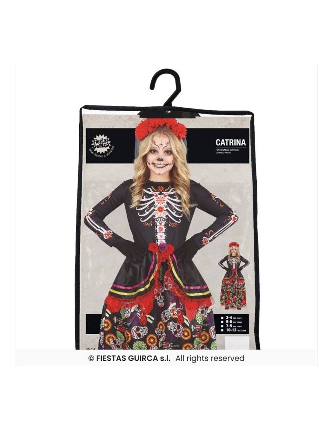 Celebra la bellezza della tradizione messicana con il Costume Catrina Messicana per bambina, disponibile nelle taglie dai 3 ai 12 anni (3-4, 5-6, 7-9, 10-12).