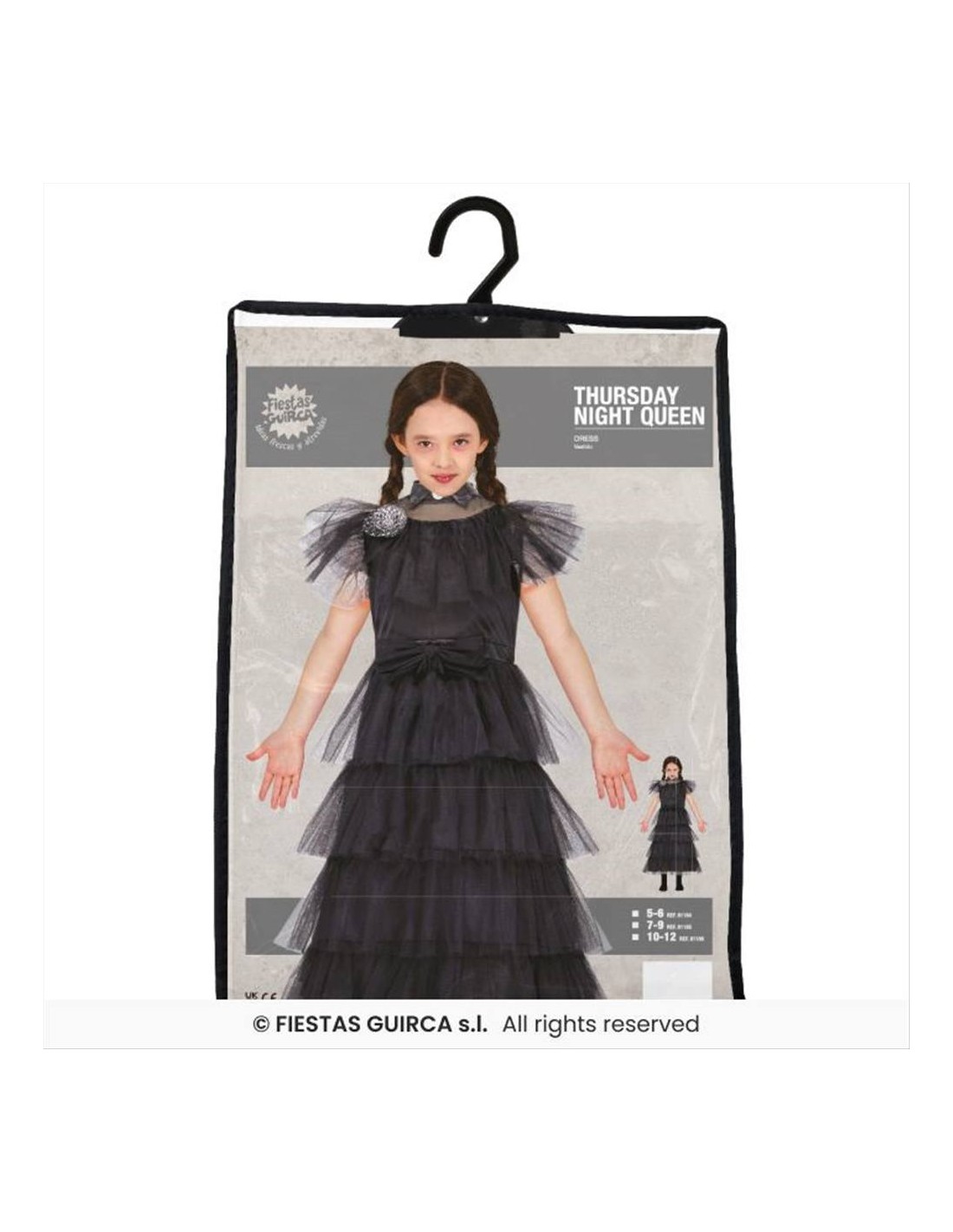 Disponibile nelle taglie dai 5 ai 12 anni, riprende l’iconico look della giovane Addams nella versione elegante da festa.