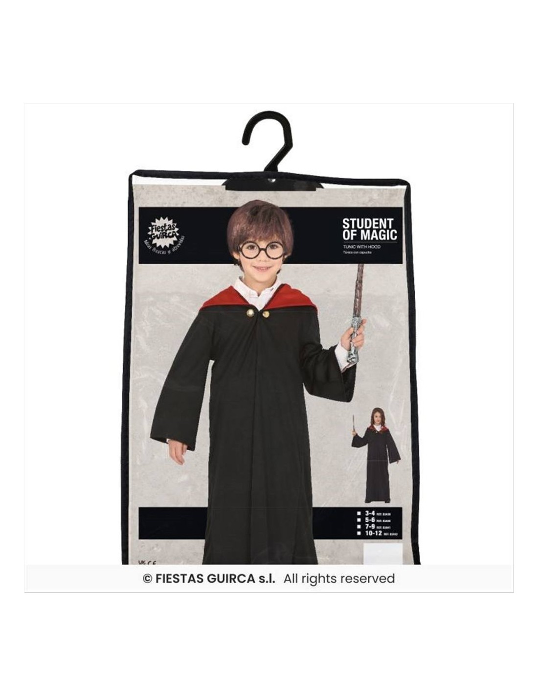 Disponibile nelle taglie dai 3 ai 12 anni, è composto da una tunica scura ispirata allo stile di Harry Potter, perfetta per feste di Halloween, compleanni a tema o recite scolastiche.