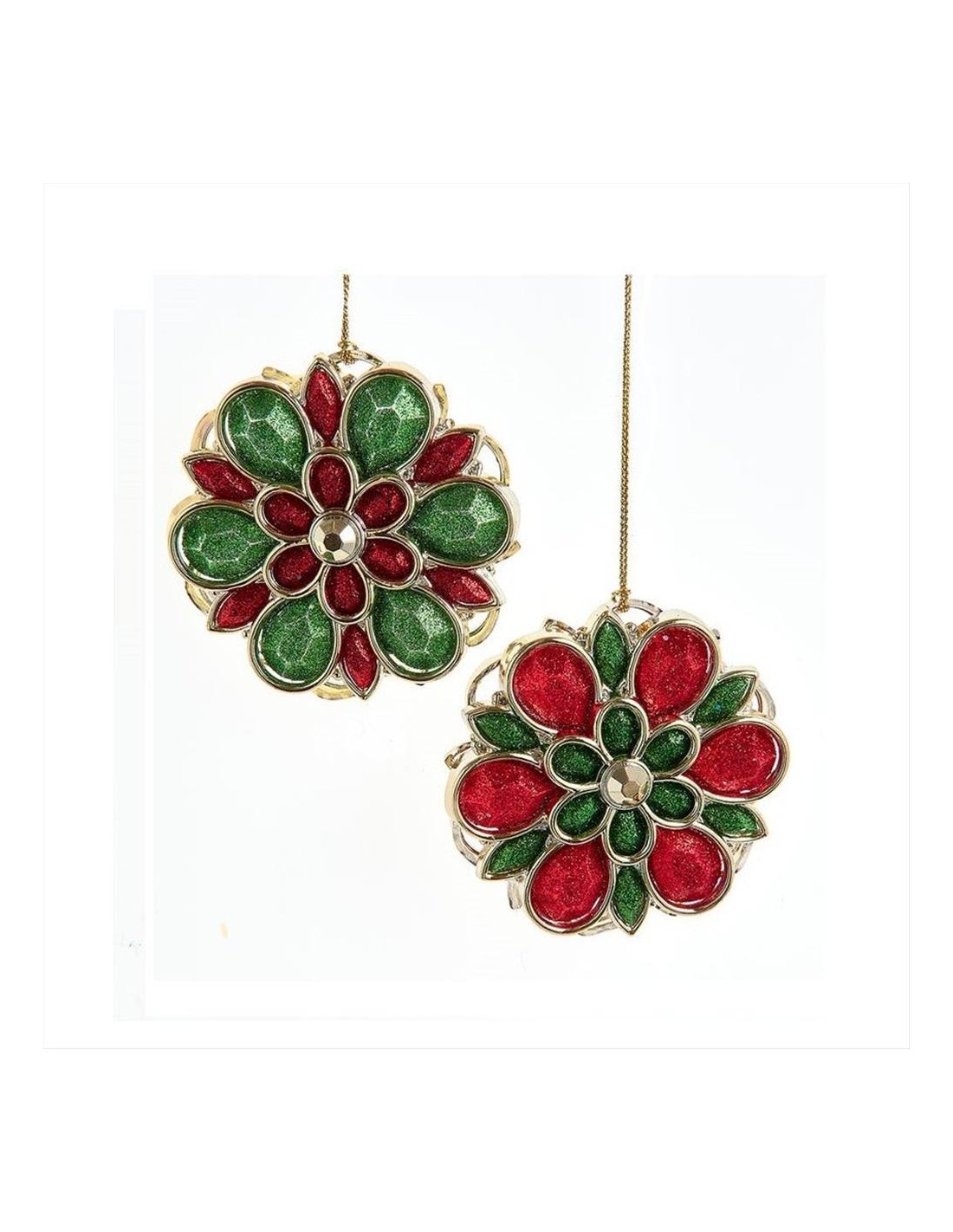 Aggiungi splendore e raffinatezza alle tue decorazioni natalizie con la Decorazione 3D Fiore Gioiello Verde, Rosso e Oro, alta 7,5 cm e disponibile in due varianti.