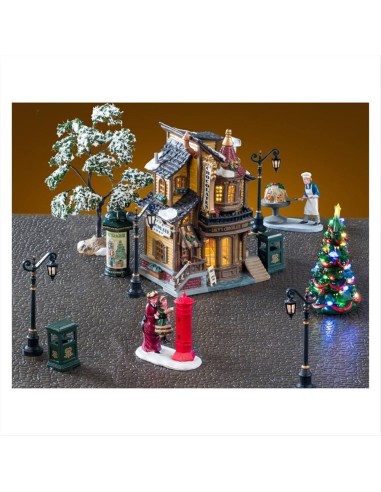 Realizzato in porcellana, con alimentazione a 4,5V e adattatore incluso, offre un’illuminazione calda e accogliente per ricreare un’atmosfera fiabesca. Con le sue vetrine ricche di prelibatezze, dettagli curati e la scena interna illuminata, questo negozio di cioccolato è il luogo ideale per aggiungere un tocco di nostalgia, calore e tradizione al tuo display Lemax.