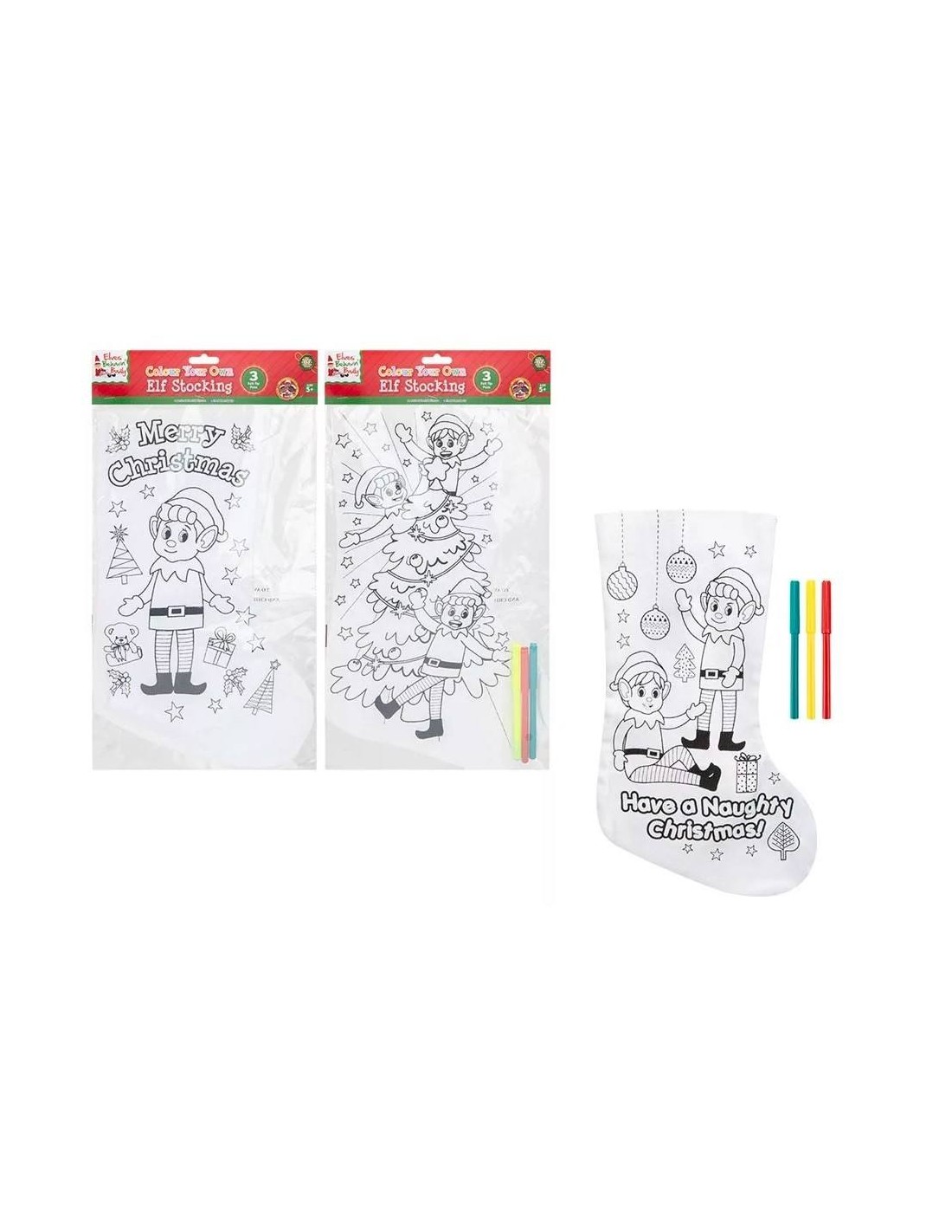 Colora la magia del Natale! 🎨🎄 Calza da colorare Elfo Monello con pennarelli azzurro, giallo e rosso. Creatività per piccoli elfi.