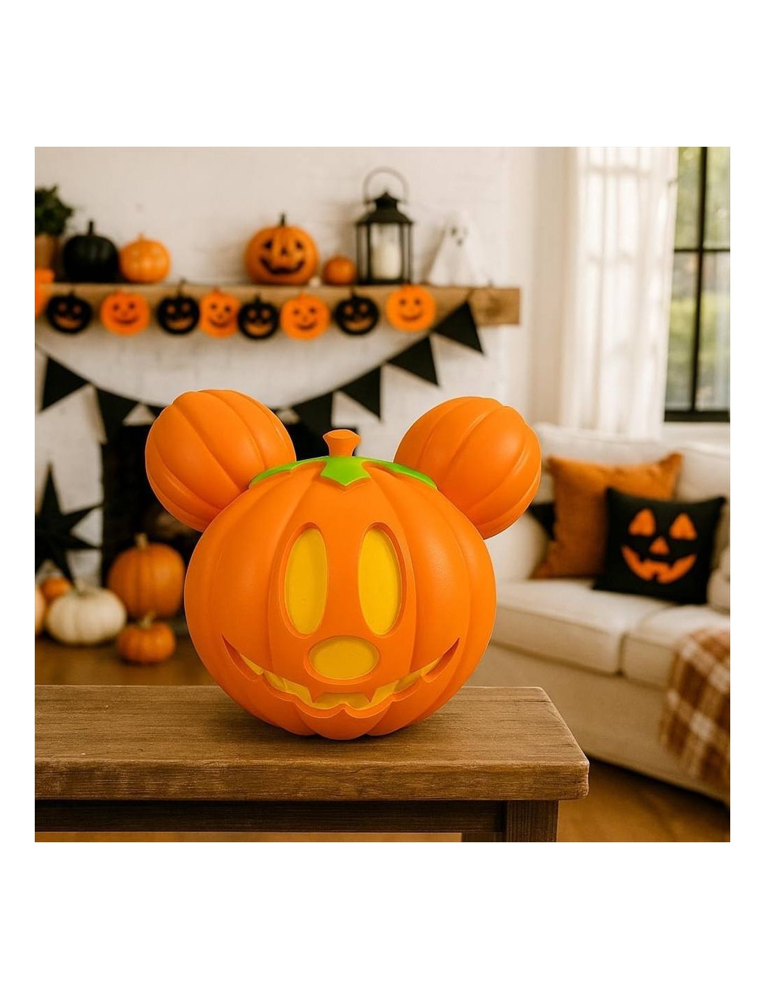 Questa decorazione Disney unisce l’allegria di Topolino alla tradizione della zucca illuminata, creando un effetto scenografico caldo e divertente.