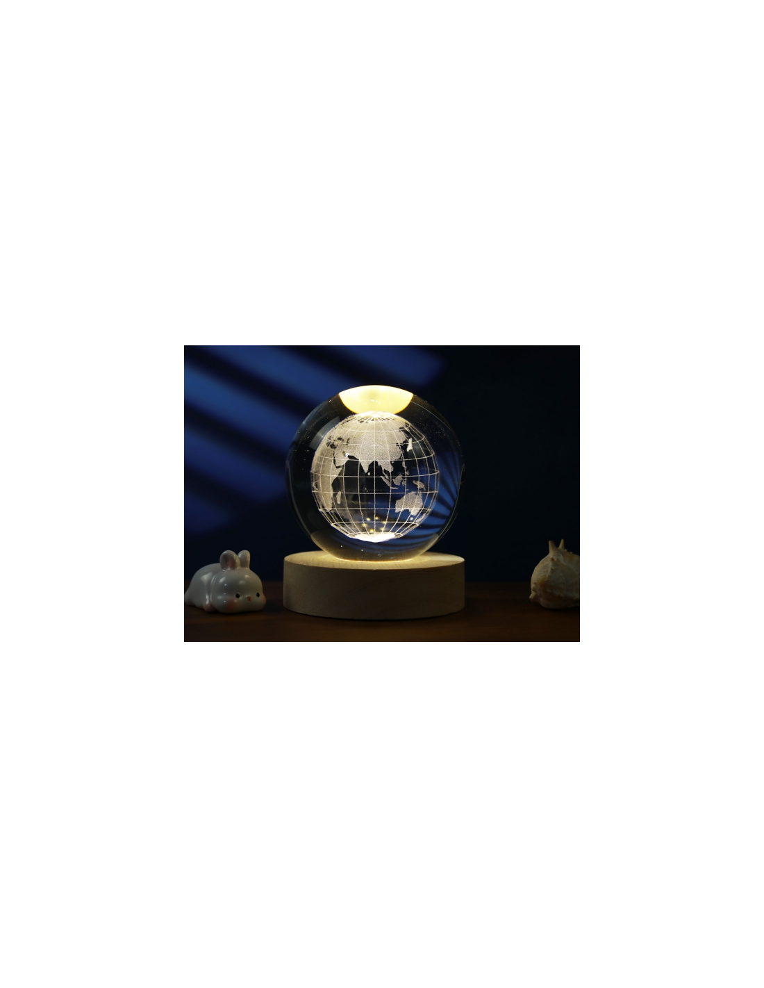 Disponibile in 3 formati – piccola (6x6x7 cm), media (8x8x9 cm) e grande (10x10x12 cm) – si adatta facilmente a comodini, scrivanie o mensole, trasformando ogni angolo in un piccolo angolo di mondo. La base in legno naturale aggiunge un tocco caldo ed elegante, mentre la tecnologia LED offre illuminazione a basso consumo e lunga durata.