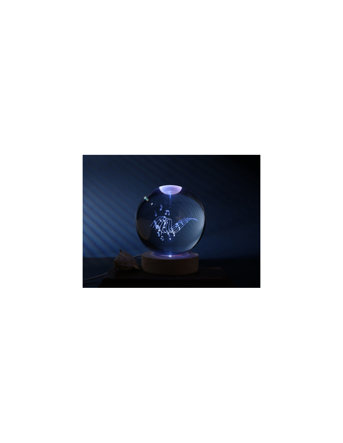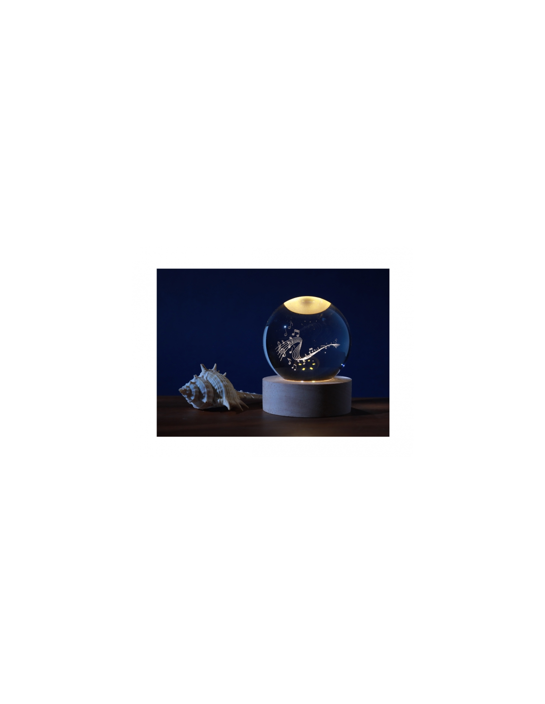 Un globo luminoso dal design elegante e moderno che racchiude uno spartito musicale inciso, creando un effetto incantevole quando acceso.