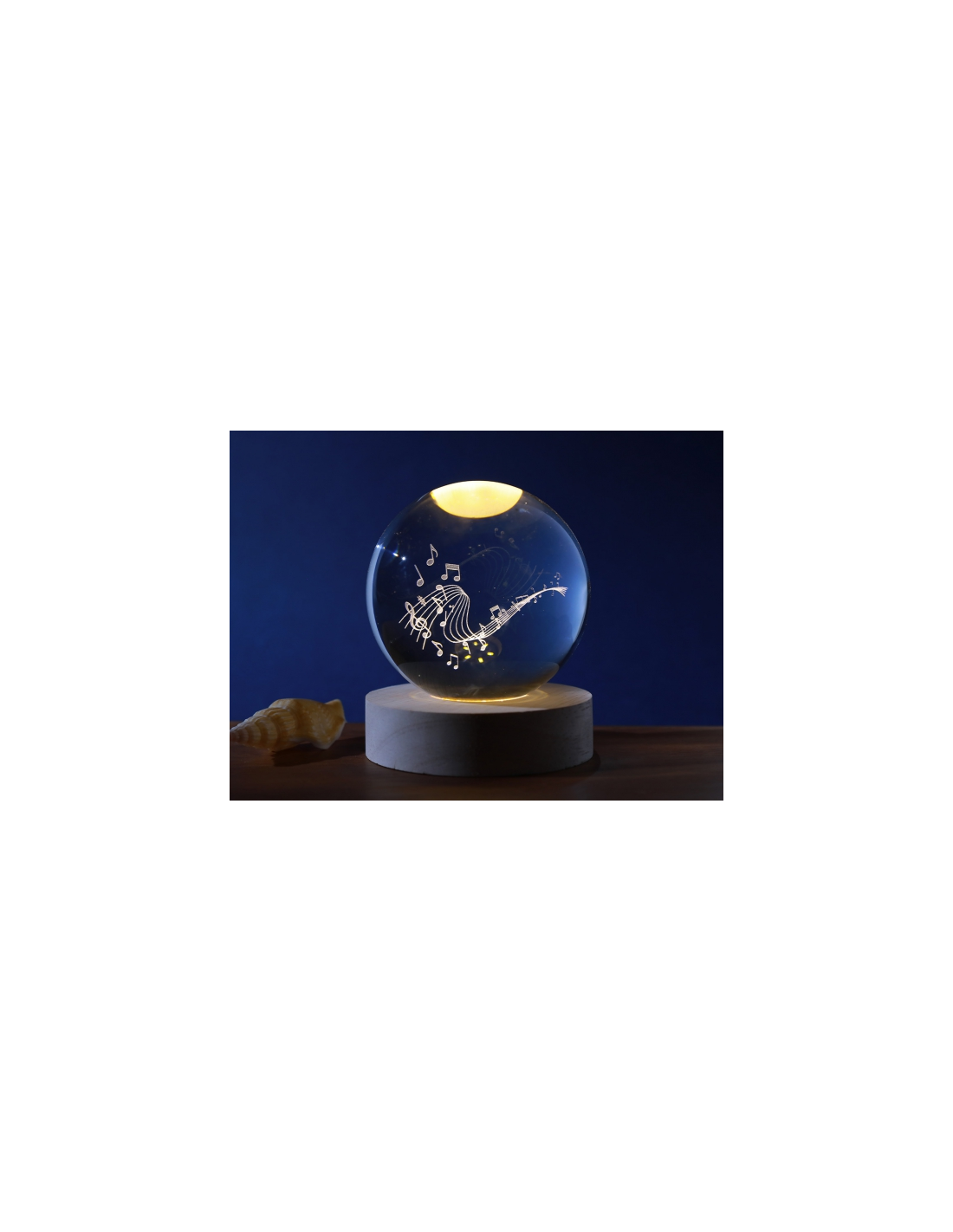 La base in legno naturale valorizza la sfera in vetro o acrilico, mentre l’illuminazione LED a basso consumo regala un’atmosfera rilassante e poetica.