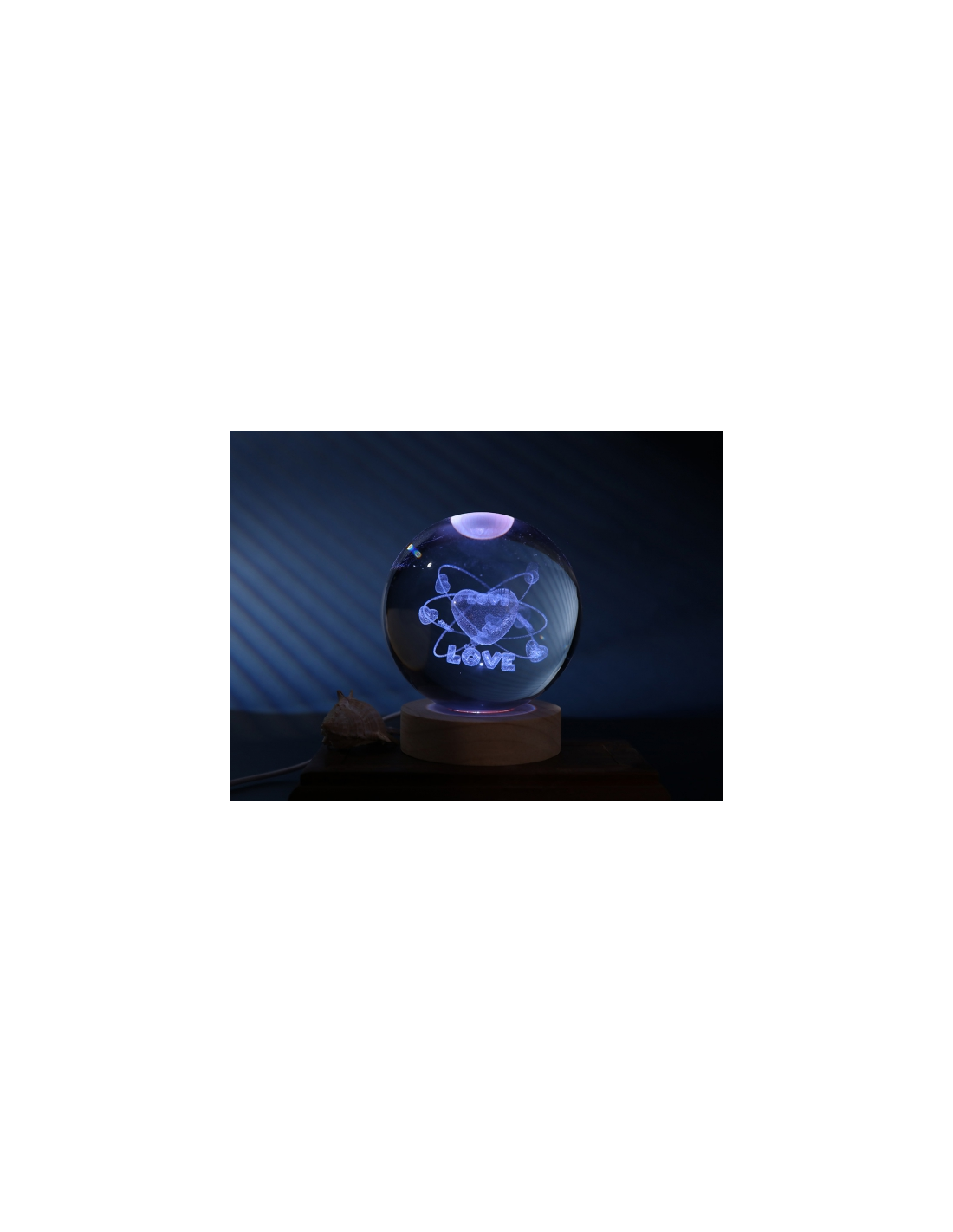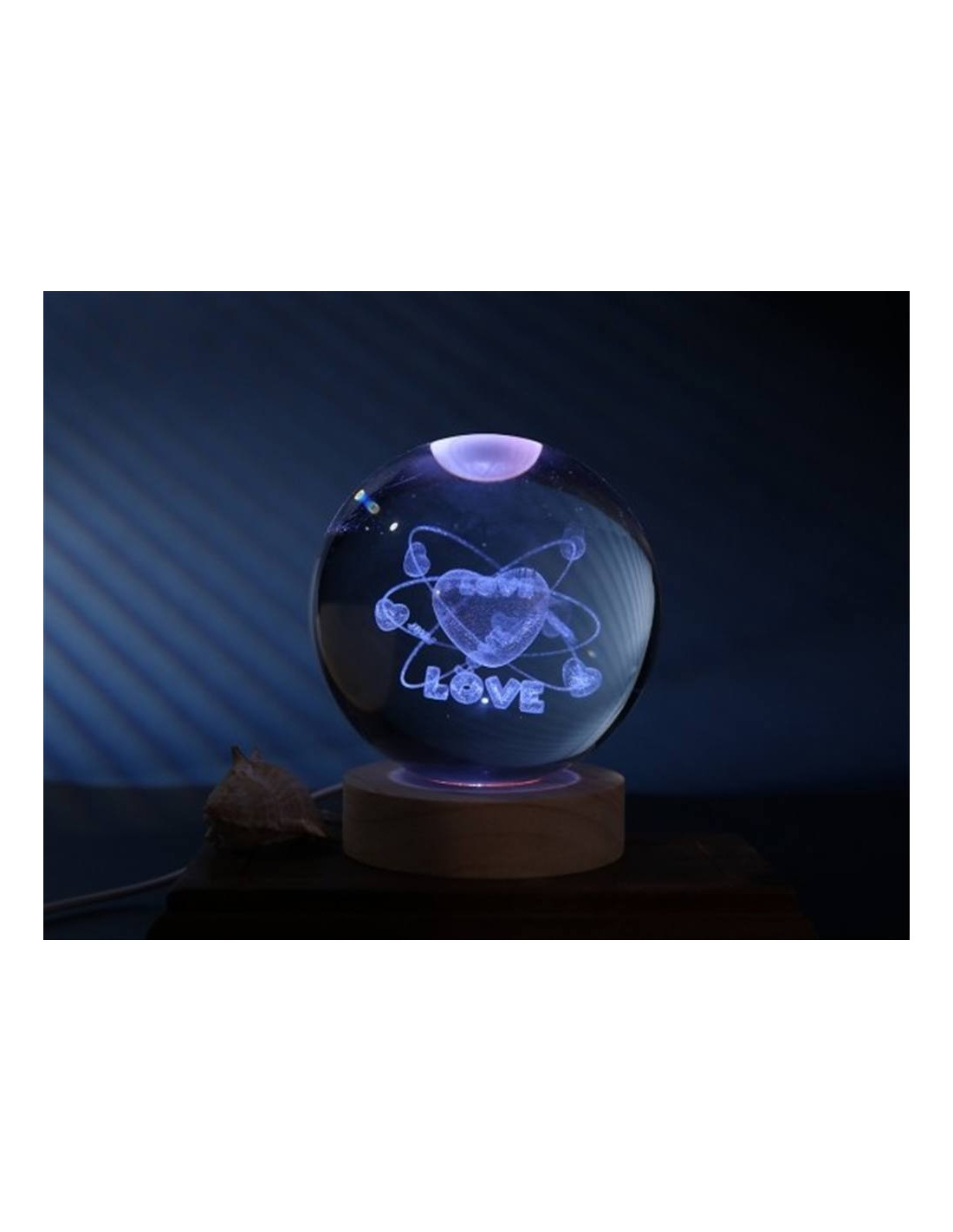 La base in legno naturale valorizza la sfera luminosa,