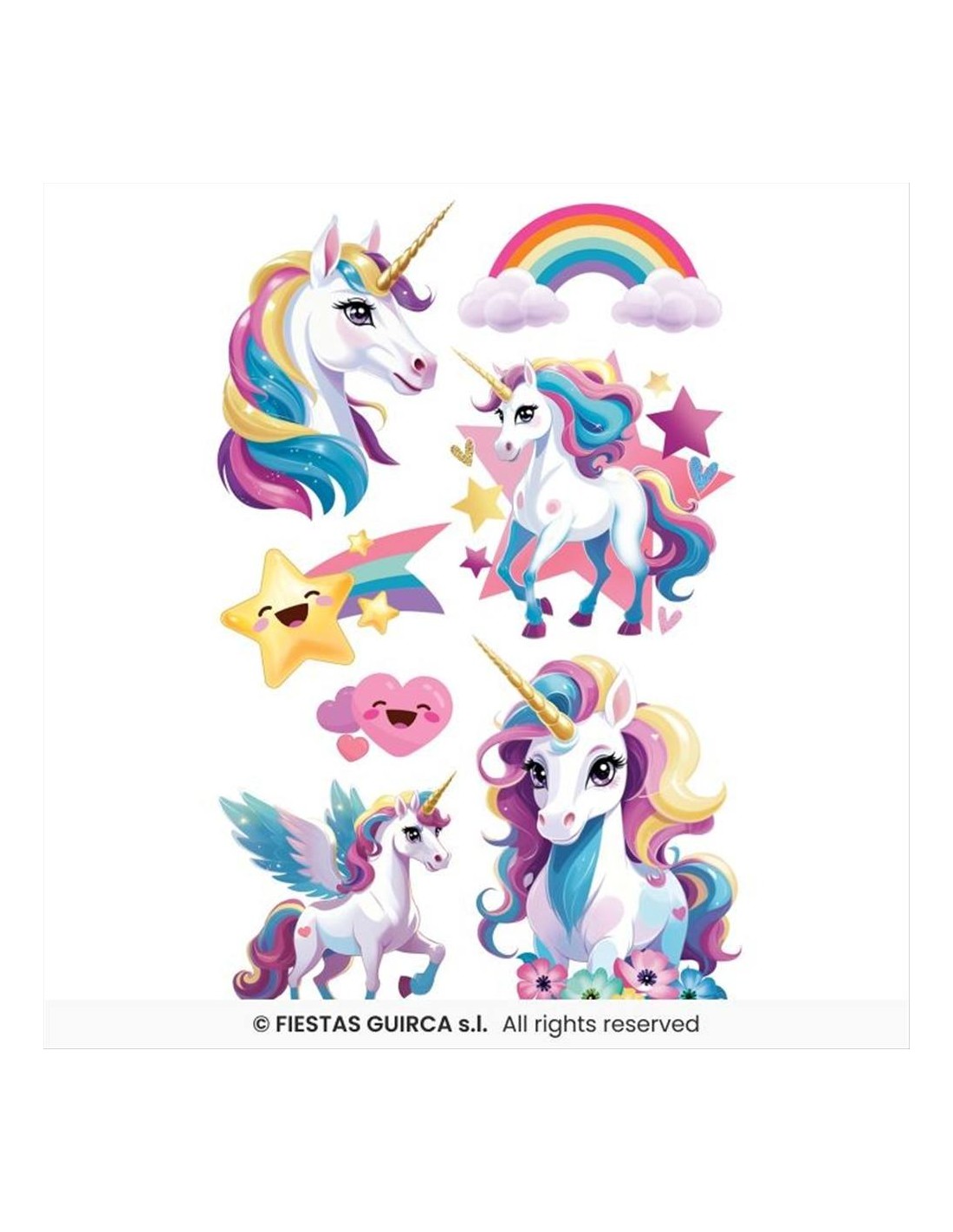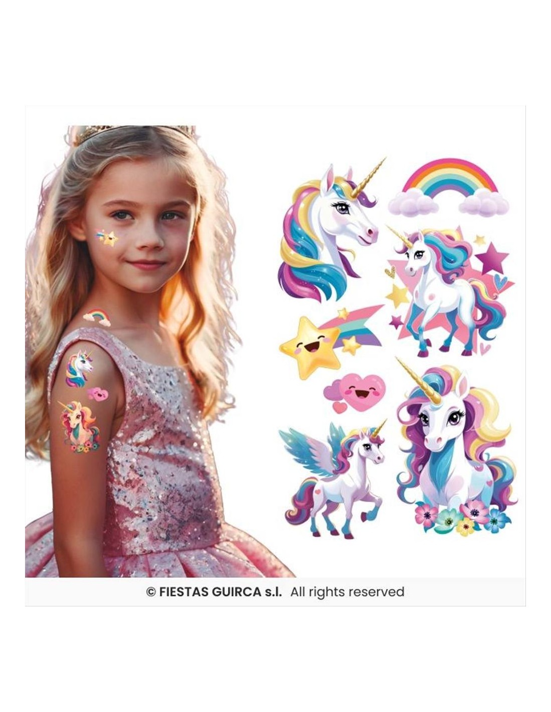 Il foglio misura 14 x 30 cm e contiene vari tatuaggi temporanei a tema unicorno, con grafiche dolci e colorate in stile fantasy. Sono perfetti per decorare braccia, mani e viso durante feste di compleanno, Carnevale, eventi scolastici o momenti di gioco creativo.