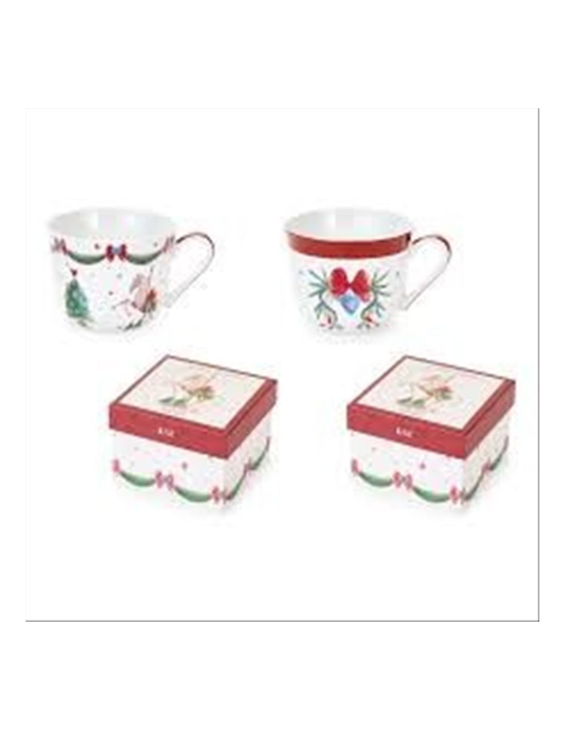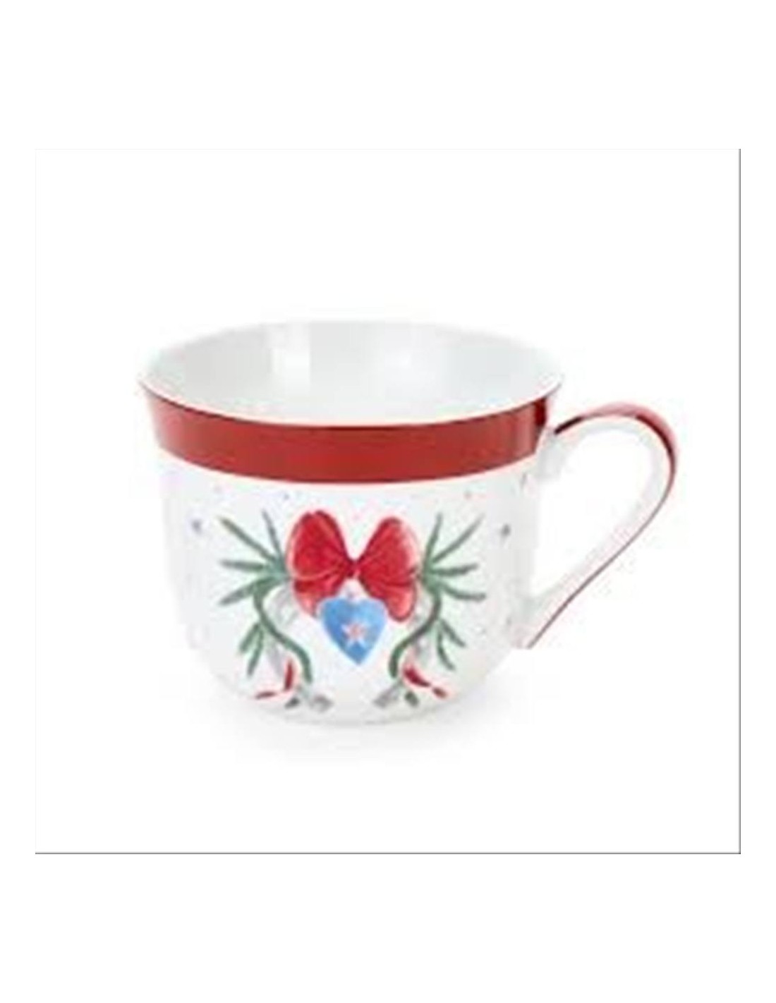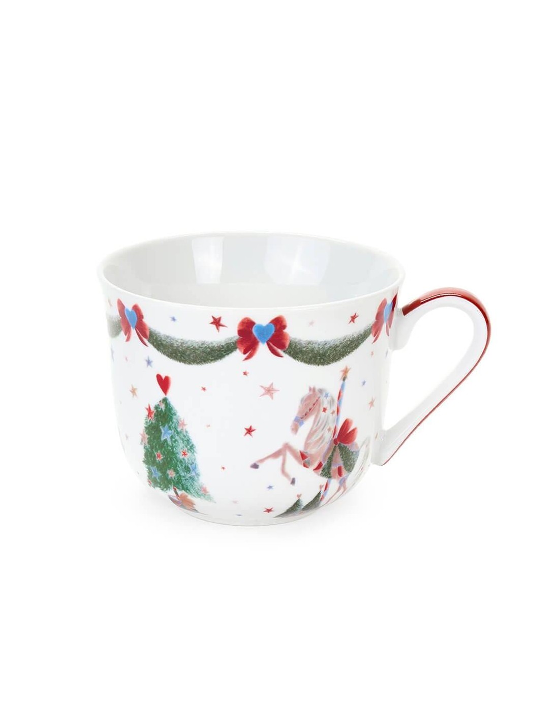 Tazza mug in porcellana 370ml decorata con cavallino a dondolo e festoni natalizi o con il fiocco natalizio. Con scatola regalo. Collezione La Giostra di Amelie.