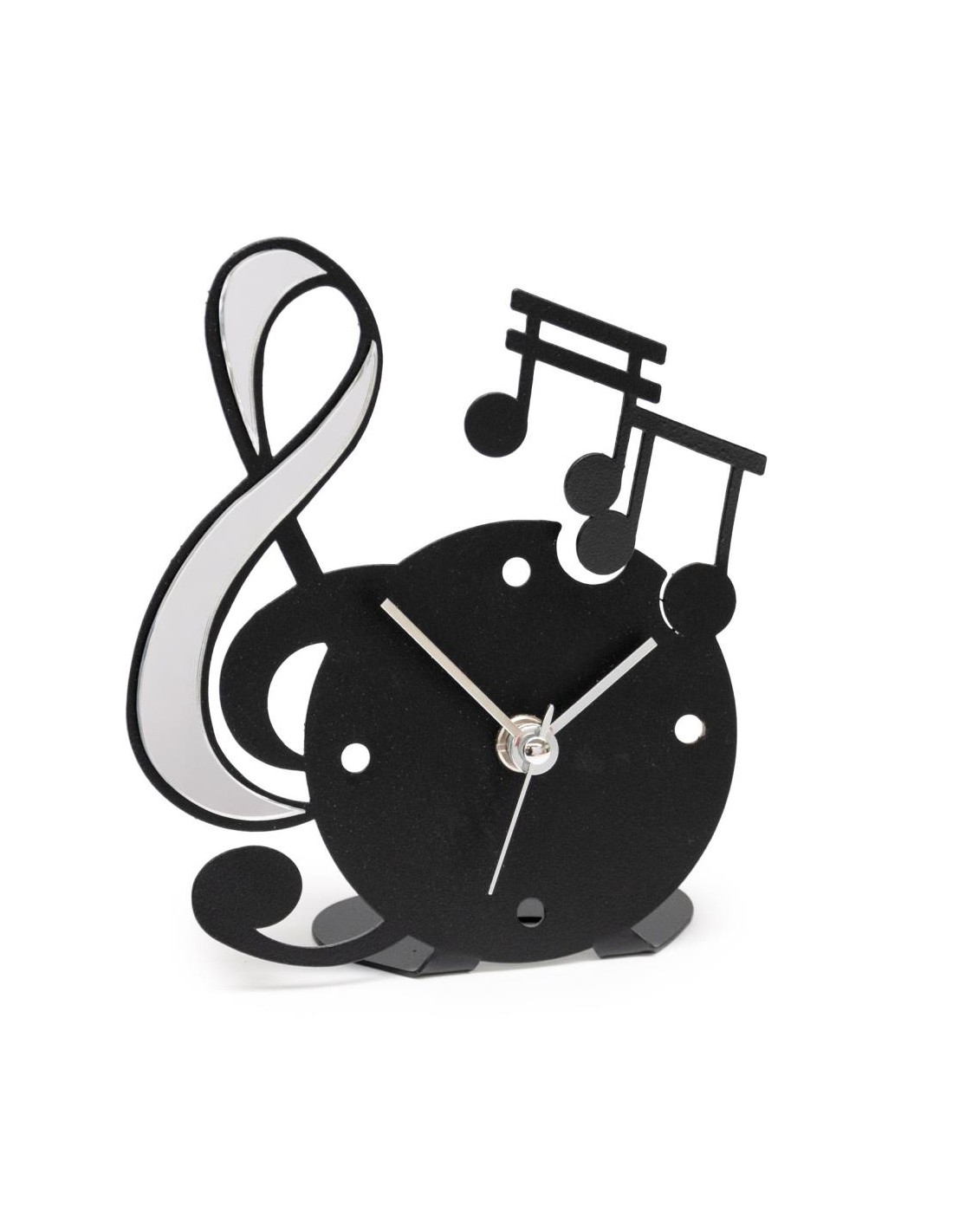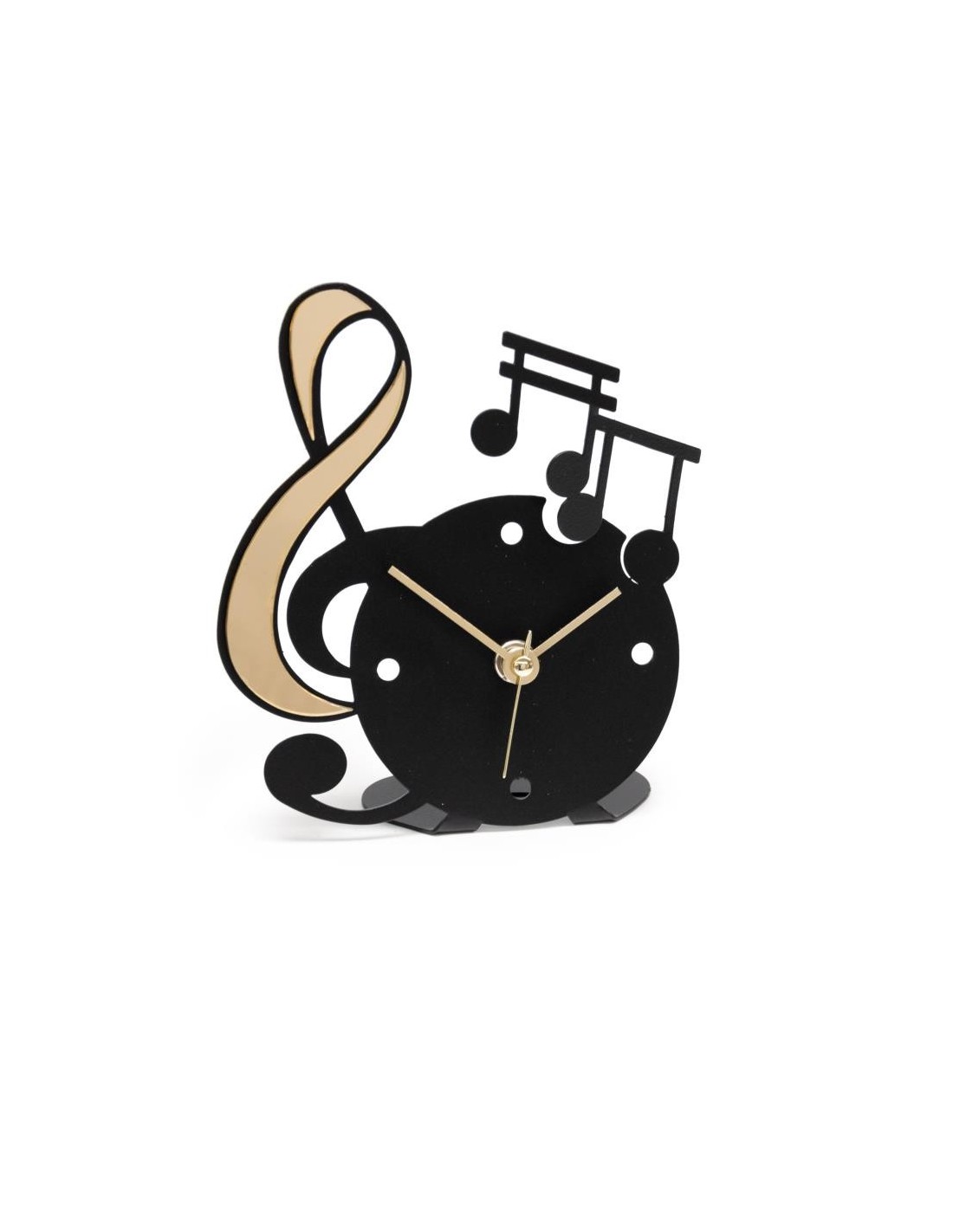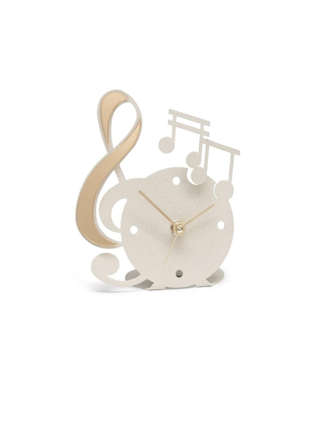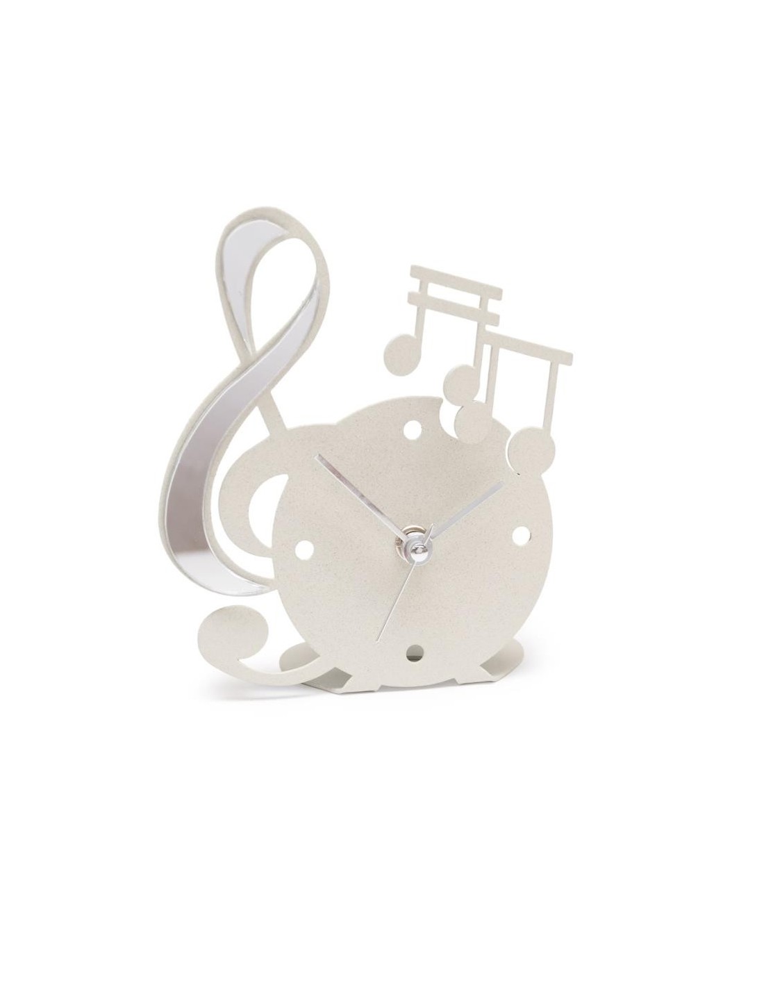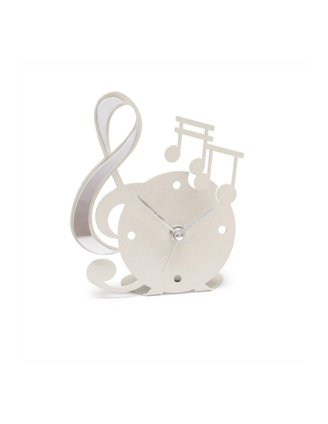 Con la sua iconica forma a chiave musicale, arricchita da note decorative in polimetilmetacrilato specchiato oro o argento, questo orologio da appoggio è una vera sinfonia di stile ed eleganza. Disponibile in avorio o nero con applicazioni a specchio dorate o argentate, si abbina perfettamente a qualsiasi scrivania, comodino o ripiano decorativo.