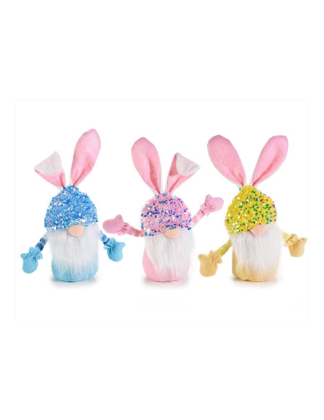 Disponibile in tre colori (azzurro, rosa e giallo), questo simpatico gnomo è perfetto per custodire i dolci preincartati o piccoli regali. Realizzato con paillettes scintillanti, ha braccia modellabili e una tasca di 10 x 8 cm per contenere prelibatezze o sorprese. Le sue dimensioni di 14 x 11 x 31 cm (orecchie estese) lo rendono ideale per decorare la tavola o regalarlo a chi ama un tocco giocoso e festivo. 🧁✨