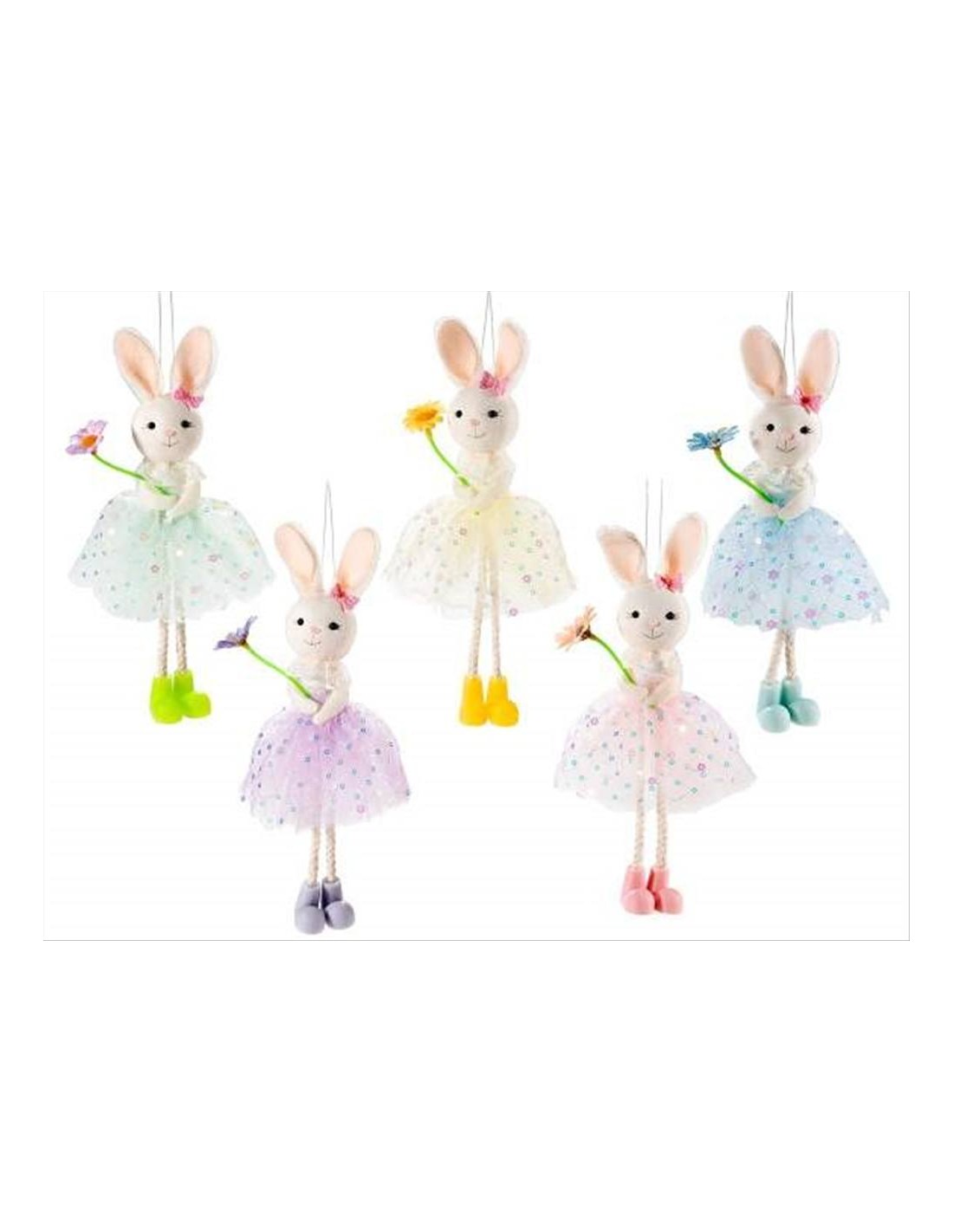 Disponibile in 5 colori (verde, giallo, azzurro, lilla, rosa), questo adorabile coniglietto da appendere è l'aggiunta perfetta per la tua decorazione pasquale. Il suo vestito in tulle e il fiorellino colorato lo rendono ancora più delizioso! 🌸💐 Con una misura di 22 cm, è ideale per decorare l’albero di Pasqua o qualsiasi angolo della tua casa. Non perdere la possibilità di portare un po' di magia primaverile! 🌼