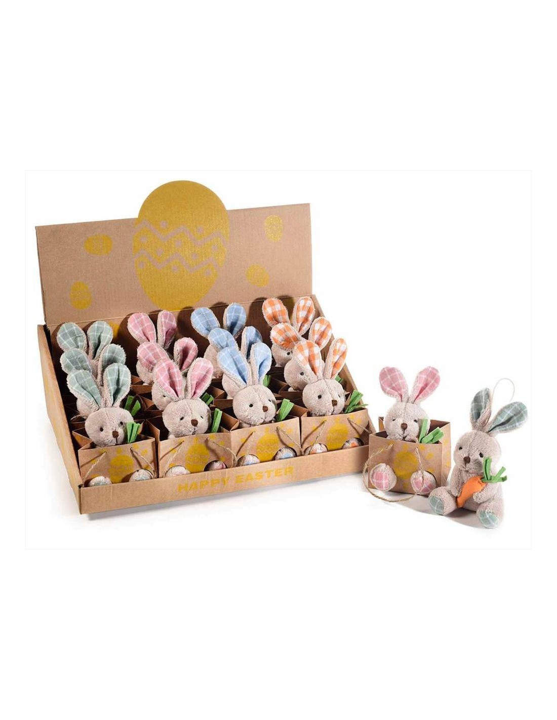 Dolcissimo coniglietto in peluche con carota, pronto a saltellare nella sua borsetta soffice! Disponibile in 4 colori con dettagli verdi, rosa, azzurri o arancioni. Ideale come sorpresa pasquale per bambini e amanti dei coniglietti!