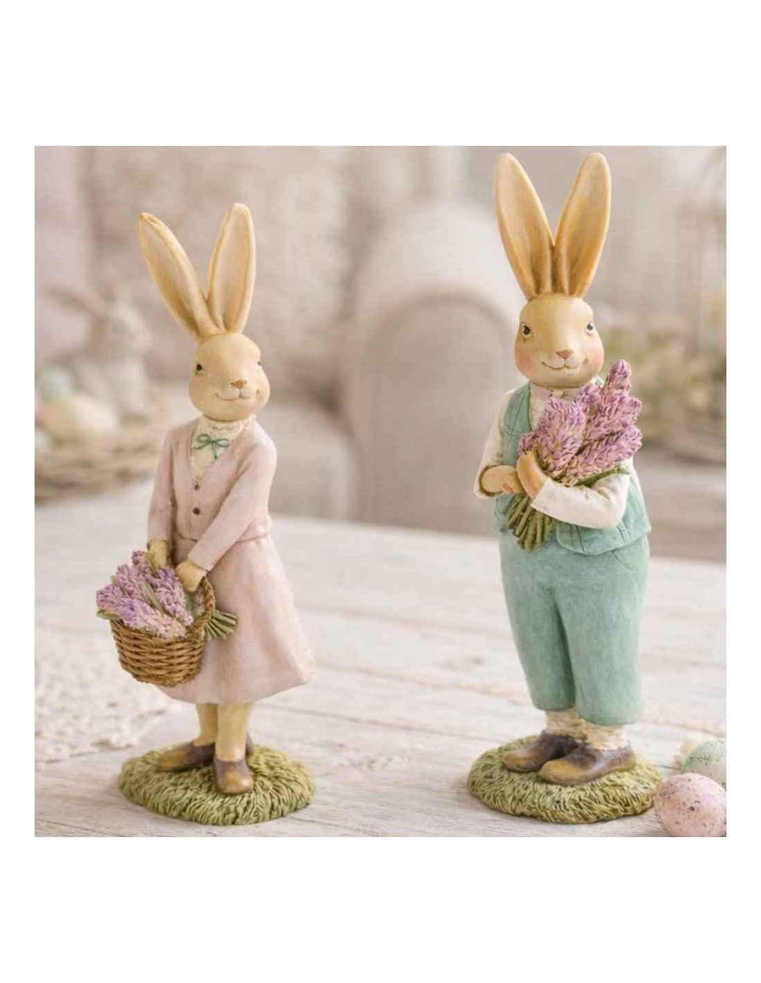 Realizzato in resina e curato nei dettagli, è disponibile nella versione Lei o Lui, entrambi con teneri elementi in lavanda che richiamano atmosfere primaverili e provenzali. Le dimensioni di 7,5 x 6 x 23,5 cm lo rendono ideale da posizionare su consolle, mensole, tavole pasquali o all’interno di composizioni stagionali.
