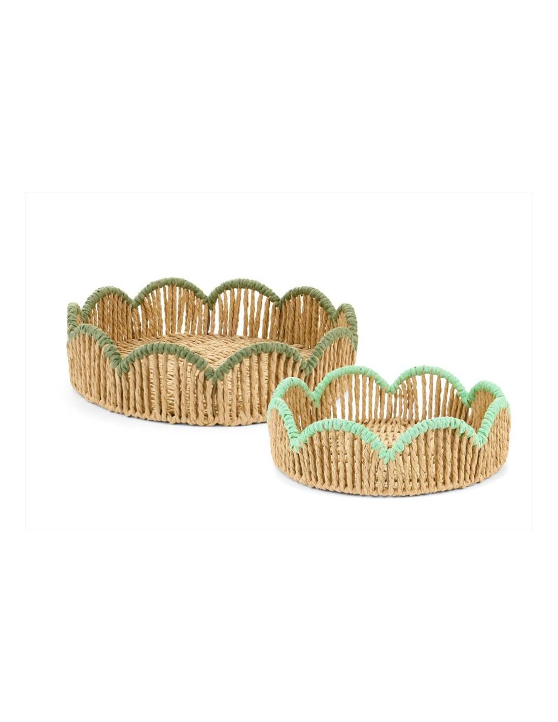 Realizzato in rattan intrecciato, si distingue per il suo bordo smerlato con rifinitura verde, un particolare elegante che richiama le tonalità fresche e rilassanti della primavera. È disponibile in due formati: il modello grande da 30 x 8 cm e quello piccolo da 25 x 7 cm, ideali per organizzare con stile piccoli oggetti, tessili leggeri o creare composizioni decorative.
