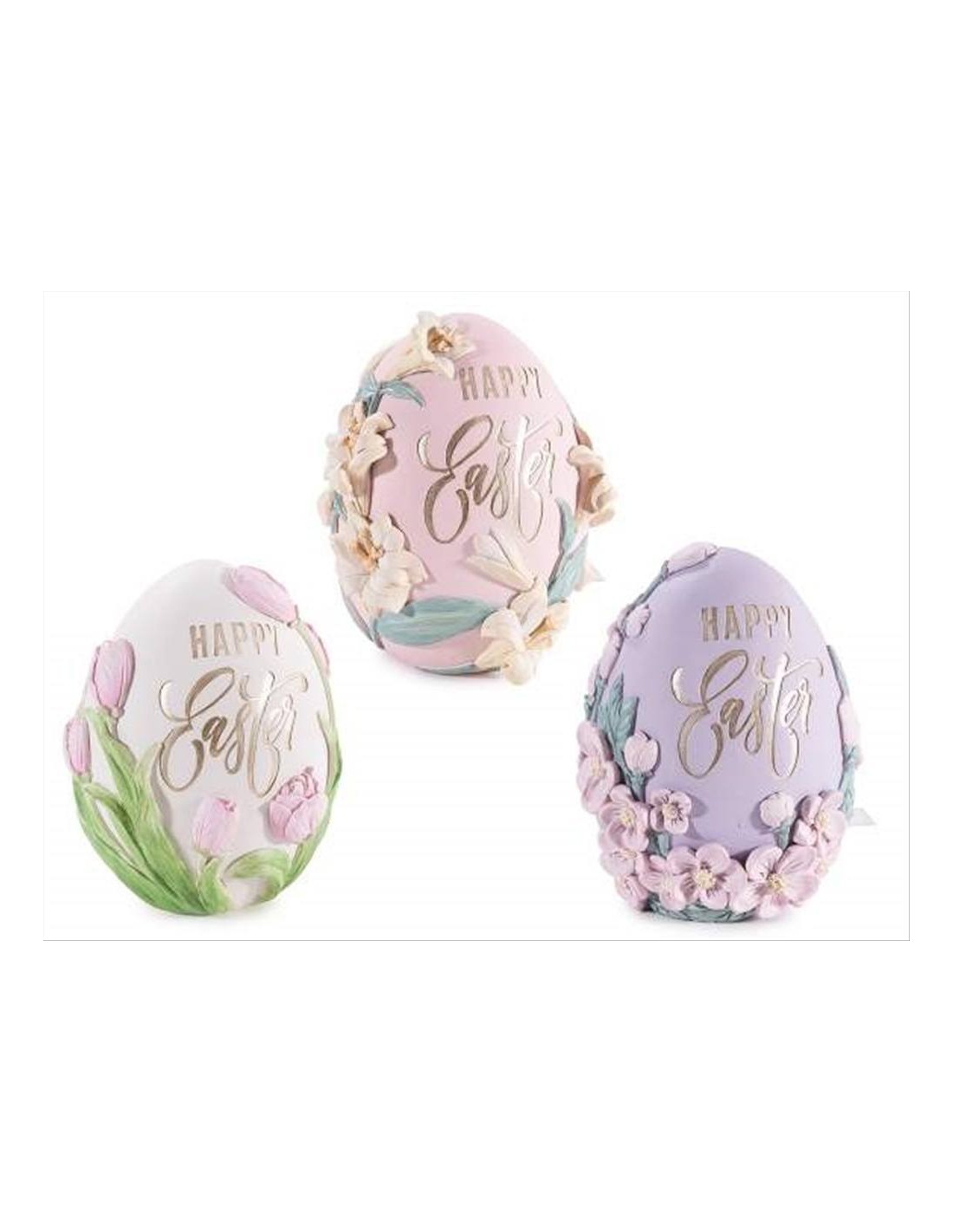 Realizzato in resina, questo uovo decorativo è impreziosito da fiori tridimensionali in rilievo e da una raffinata scritta dorata Happy Easter, che dona luminosità e un tocco elegante alla composizione.