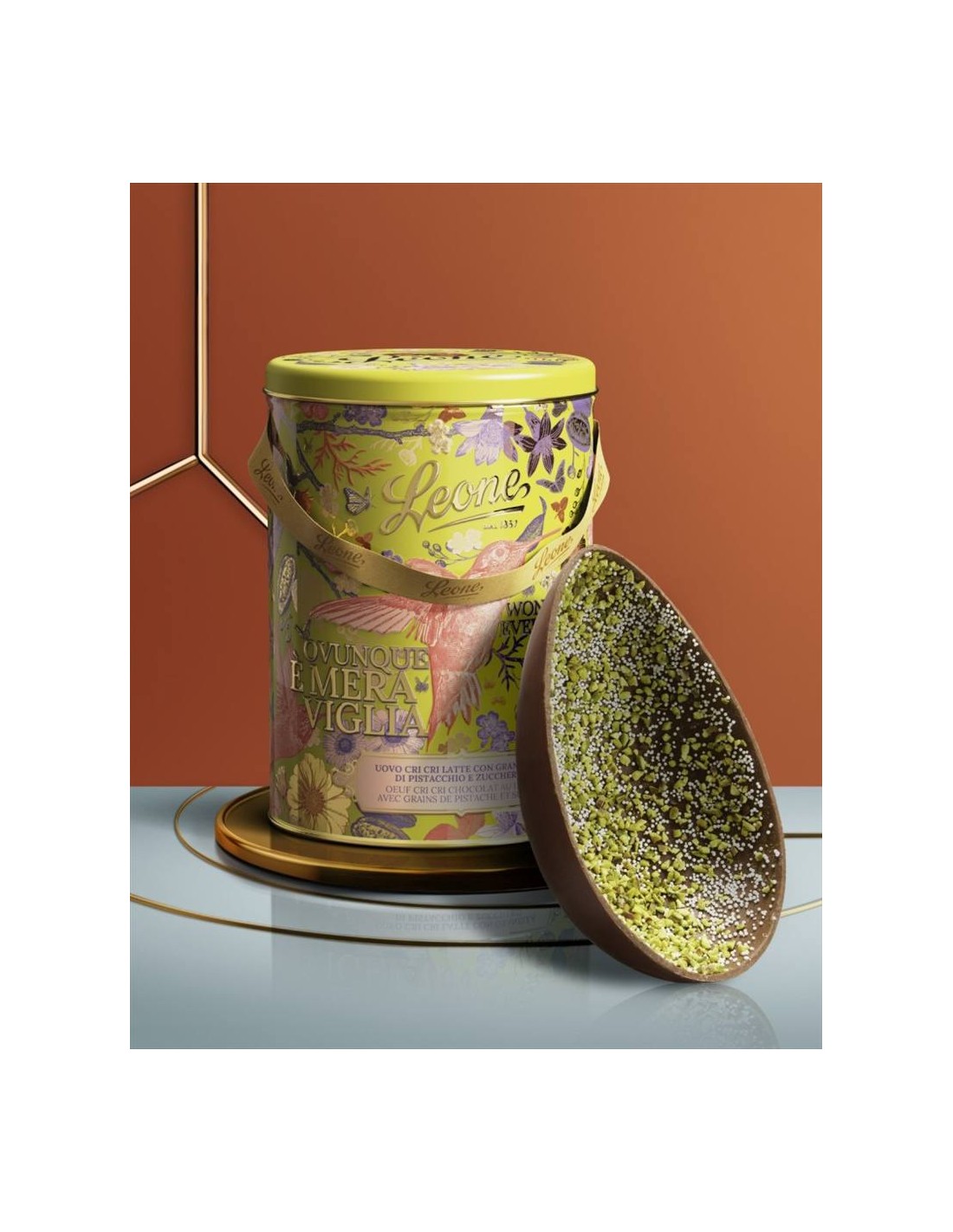 L'Uovo Cri Cri al Latte 40% con granella di pistacchio Leone Giardino Segreto è una vera tentazione per chi ama il cioccolato al latte e le consistenze croccanti.