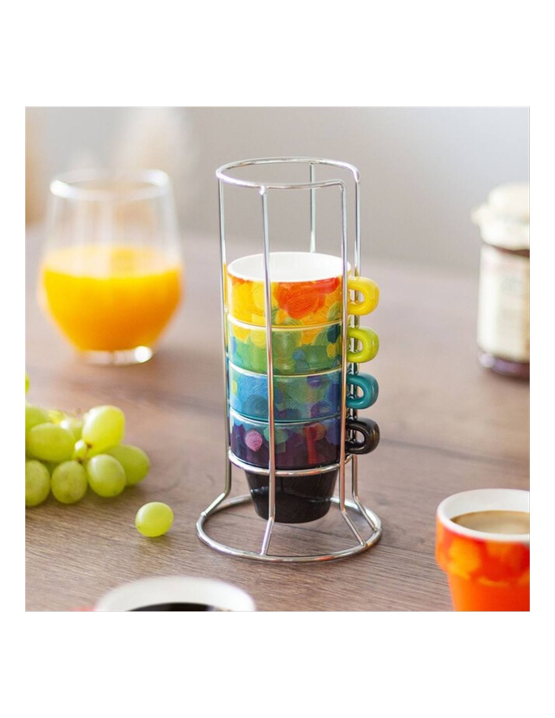 Le tazzine sono realizzate in porcellana e si impilano su una pratica struttura in acciaio inossidabile, formando una vera e propria torre decorativa che arreda la cucina con colore e creatività. Con la loro capacità di 60 ml, sono perfette per espresso e caffè corto.