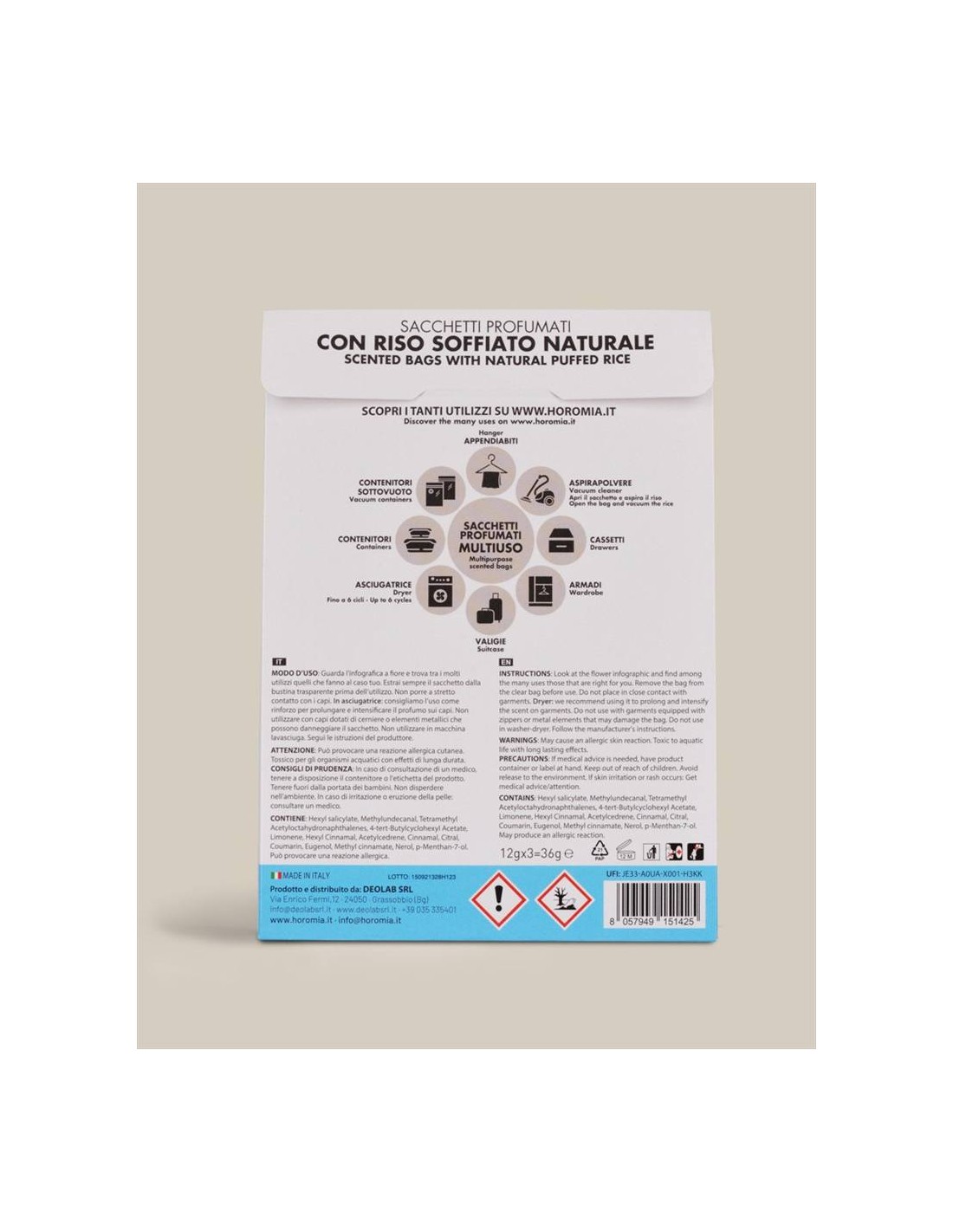 L’unicità e l’intensità delle fragranze Horomia ora in Sacchetti Profumati Multiuso. Creati con riso soffiato naturale non alimentare, i sacchetti profumati Horomia sono formulati per donare ai tuoi capi e alla tua casa il profumo unico e inconfondibile della tua fragranza preferita. Ogni confezione contiene tre sacchetti profumati avvolti in una busta trasparente ad alta protezione, per un profumo intenso e duraturo fino a 12 settimane.