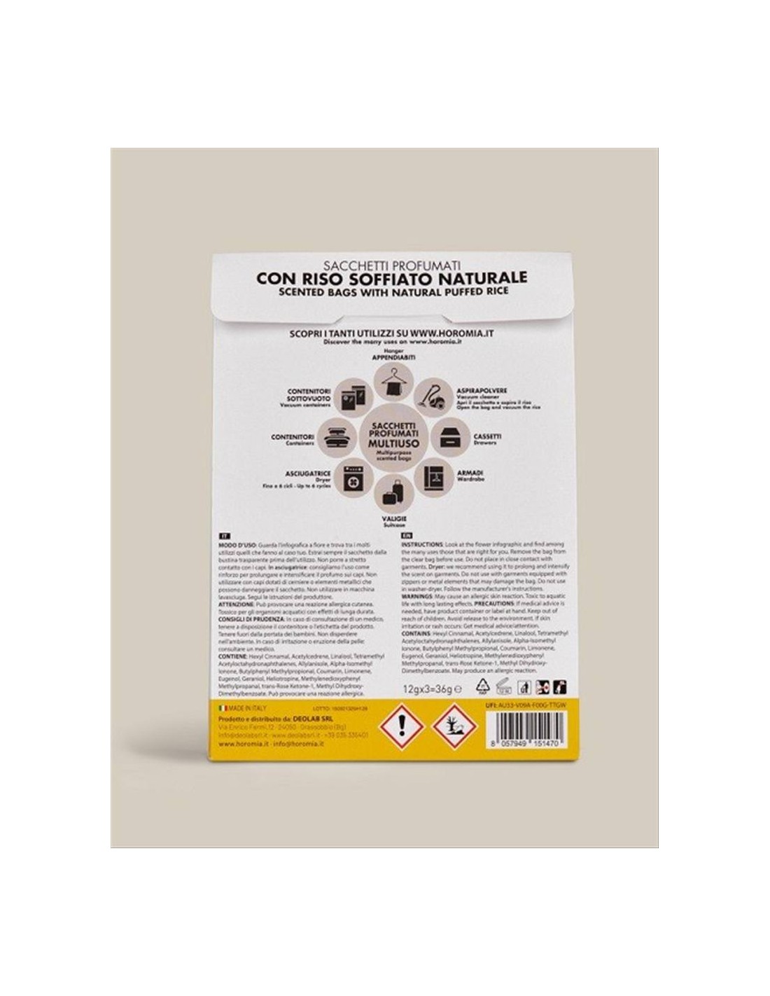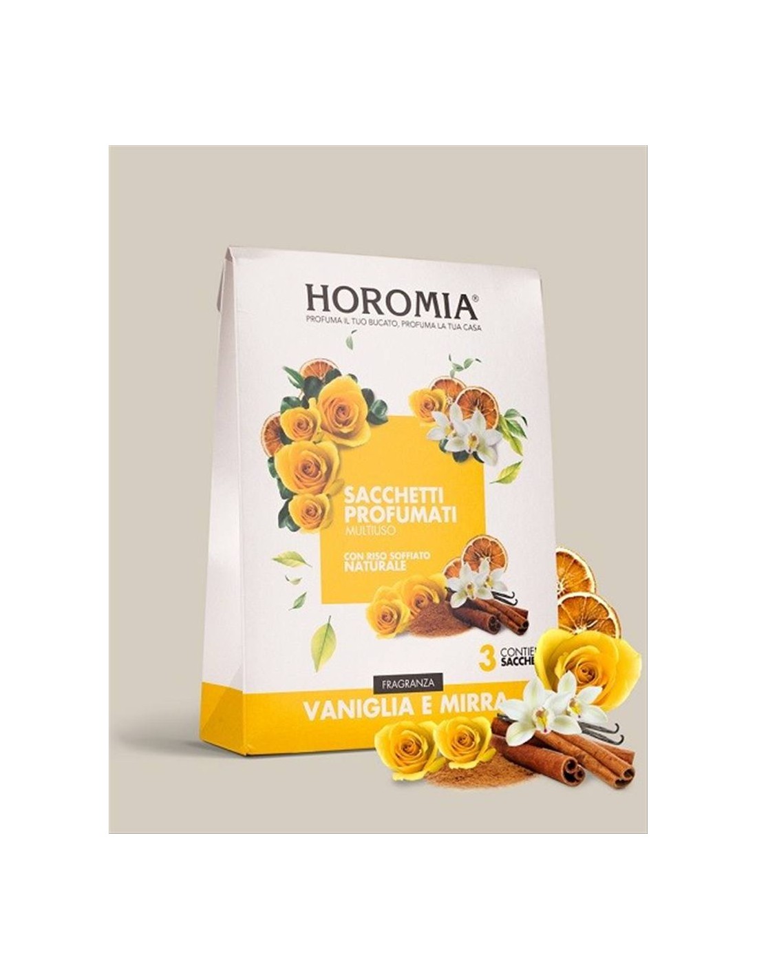 I Sacchetti Profumati VANIGLIA E MIRRA Horomia offrono una fragranza unica che avvolge la tua casa e i tuoi capi con l’intensità di note speziate e legnose. Ogni confezione contiene 3 sacchetti profumati realizzati con riso soffiato naturale, formulati per durare fino a 12 settimane, regalando freschezza e profumo a lungo. Perfetti per essere utilizzati in armadi, cassetti, auto e altri ambienti, questi sacchetti sono un must per chi cerca una fragranza avvolgente e sofisticata.