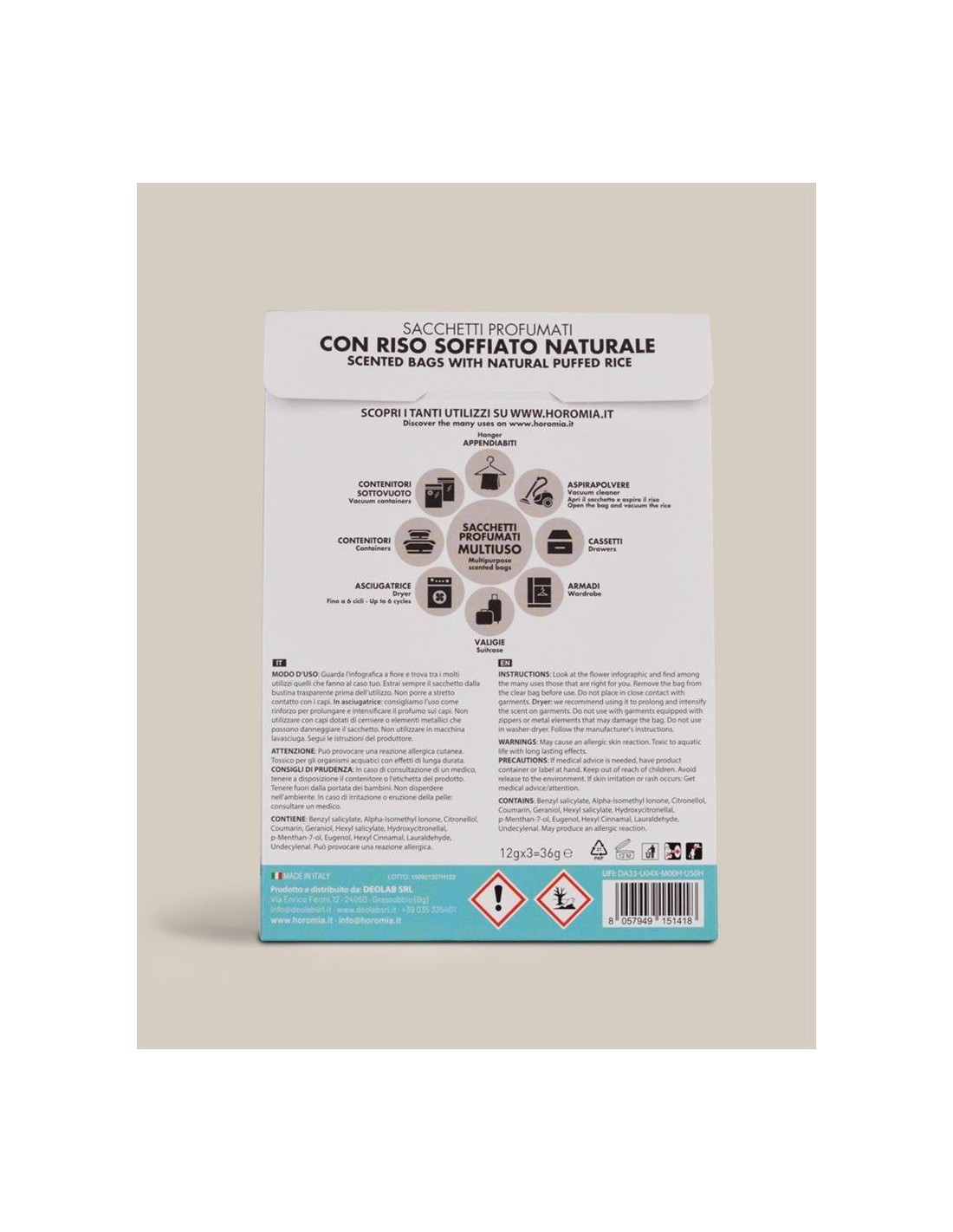 L’unicità e l’intensità delle fragranze Horomia ora in Sacchetti Profumati Multiuso. Creati con riso soffiato naturale non alimentare, i sacchetti profumati Horomia sono formulati per donare ai tuoi capi e alla tua casa il profumo unico e inconfondibile della tua fragranza preferita. Ogni confezione contiene tre sacchetti profumati avvolti in una busta trasparente ad alta protezione, per un profumo intenso e duraturo fino a 12 settimane.