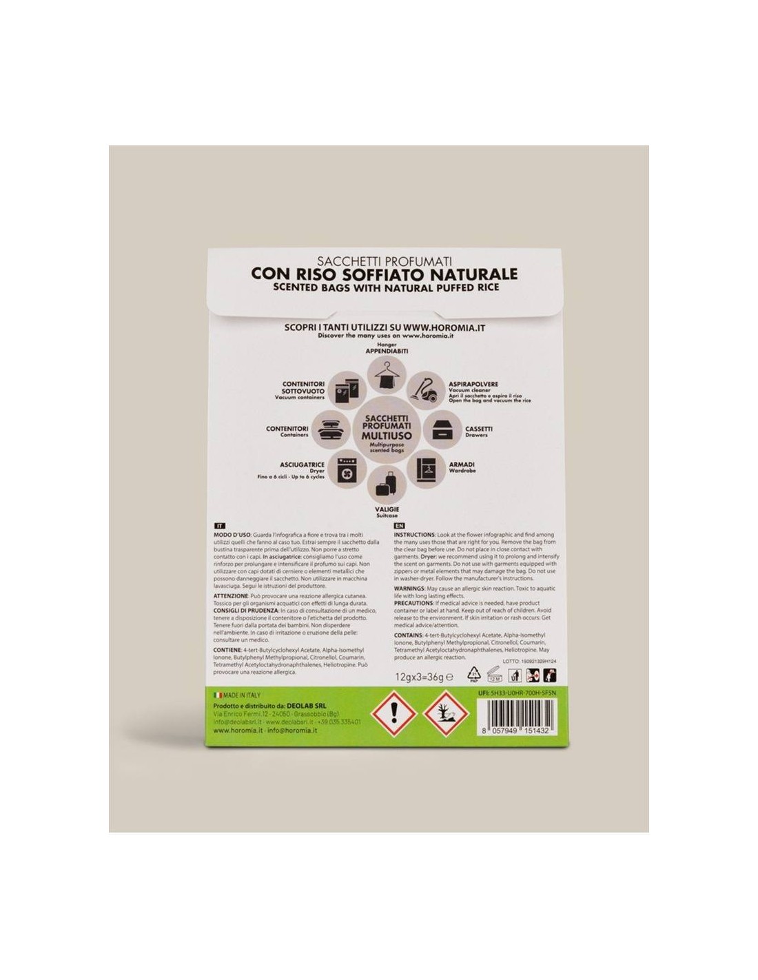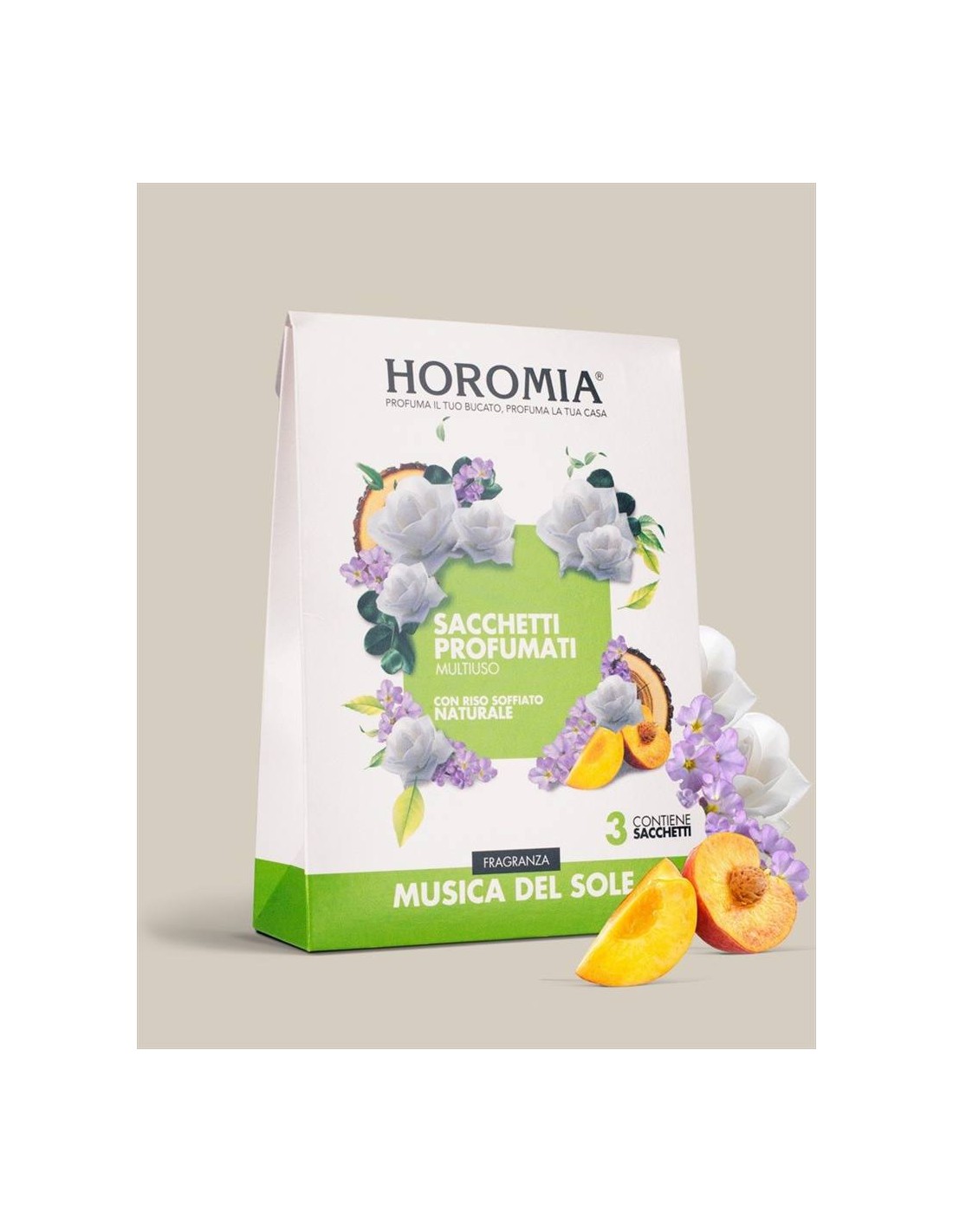 L’unicità e l’intensità delle fragranze Horomia ora in Sacchetti Profumati Multiuso. Creati con riso soffiato naturale non alimentare, i sacchetti profumati Horomia sono formulati per donare ai tuoi capi e alla tua casa il profumo unico e inconfondibile della tua fragranza preferita. Ogni confezione contiene tre sacchetti profumati avvolti in una busta trasparente ad alta protezione, per un profumo intenso e duraturo fino a 12 settimane.