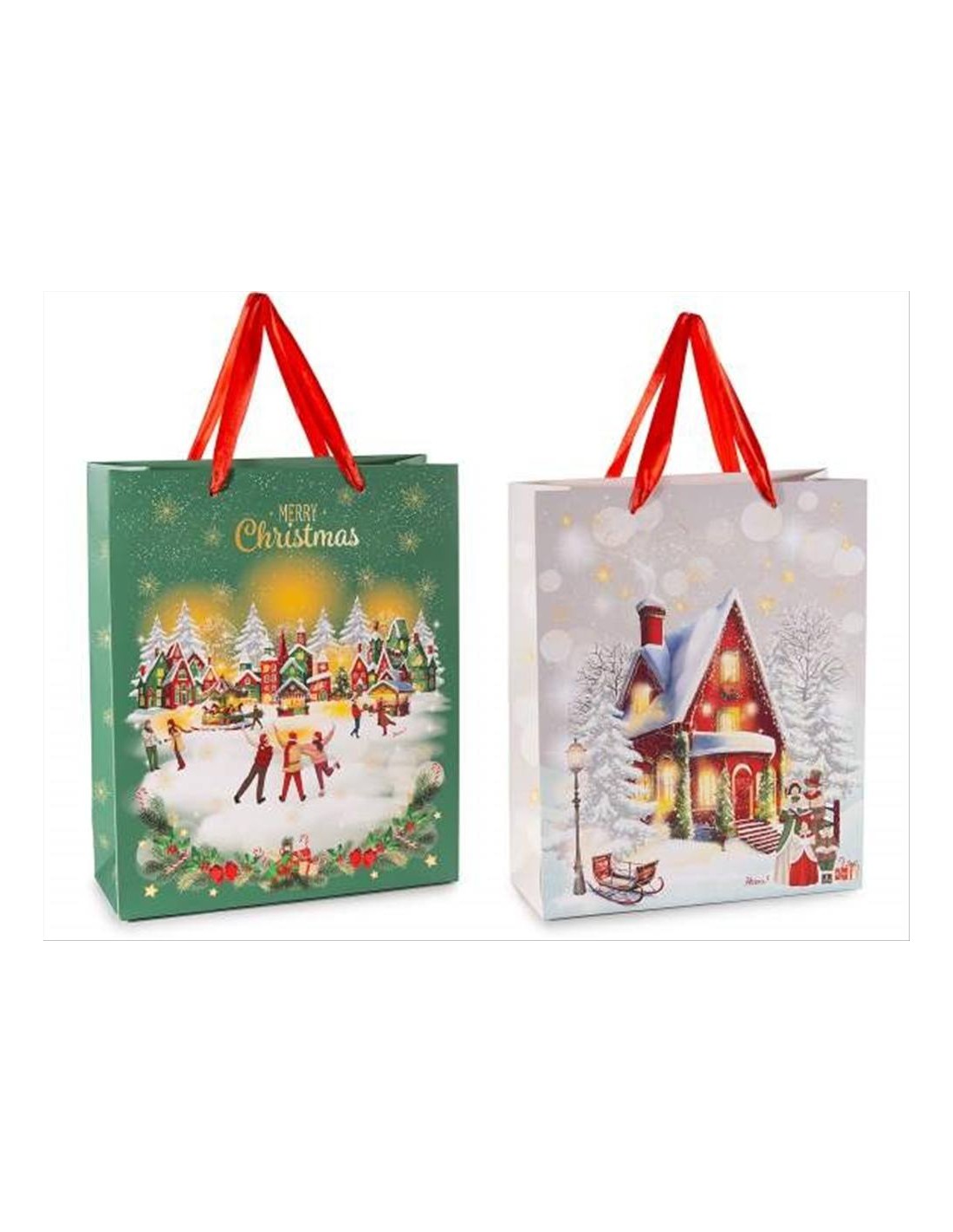 Porta i tuoi regali con stile! 🎄 Busta grande con paesaggi natalizi, disponibile in verde o bianco. Spaziosa e resistente!
