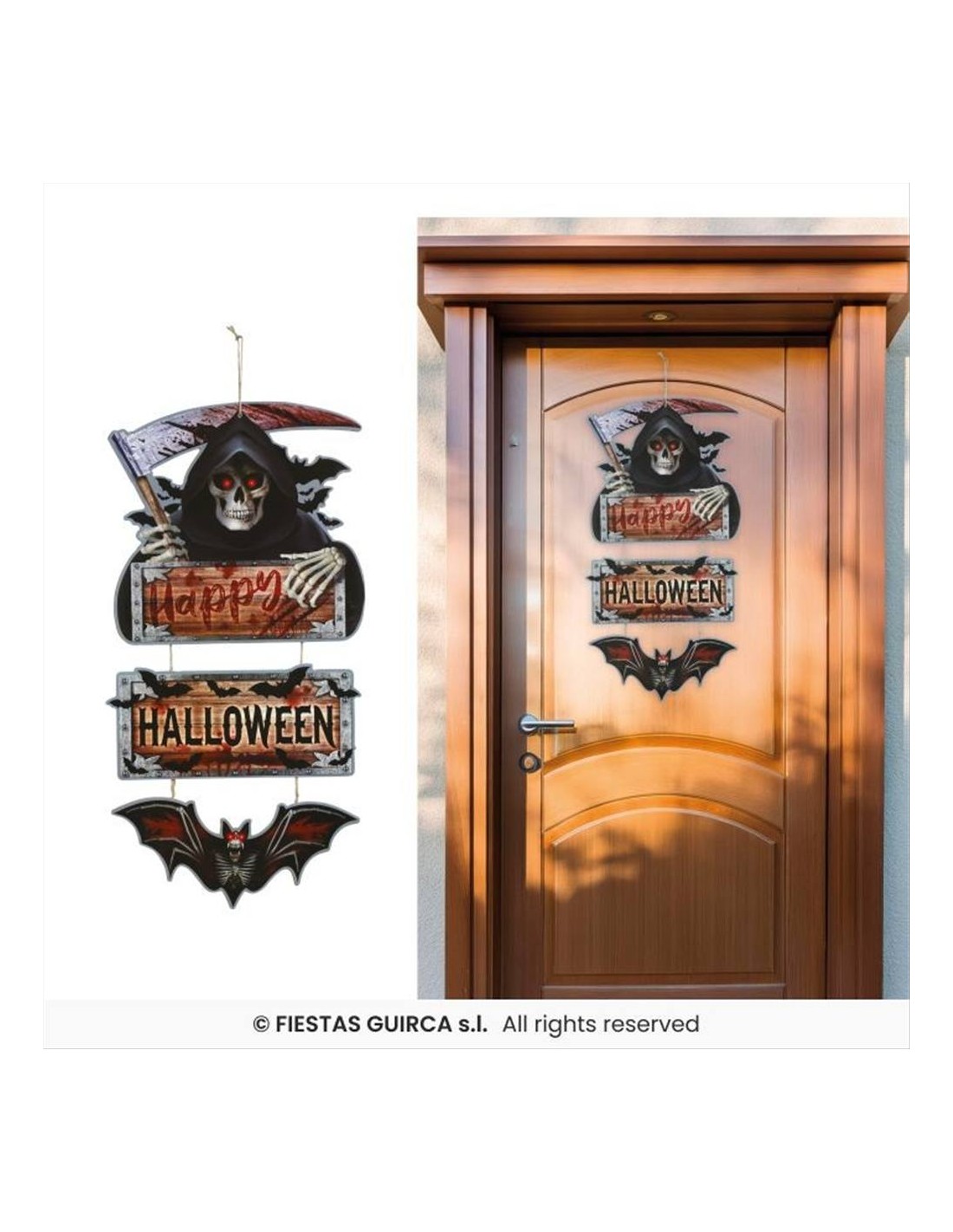 Accogli i tuoi ospiti con un brivido grazie alla Targhetta in legno Mietitore Happy Halloween 60cm 💀👻!