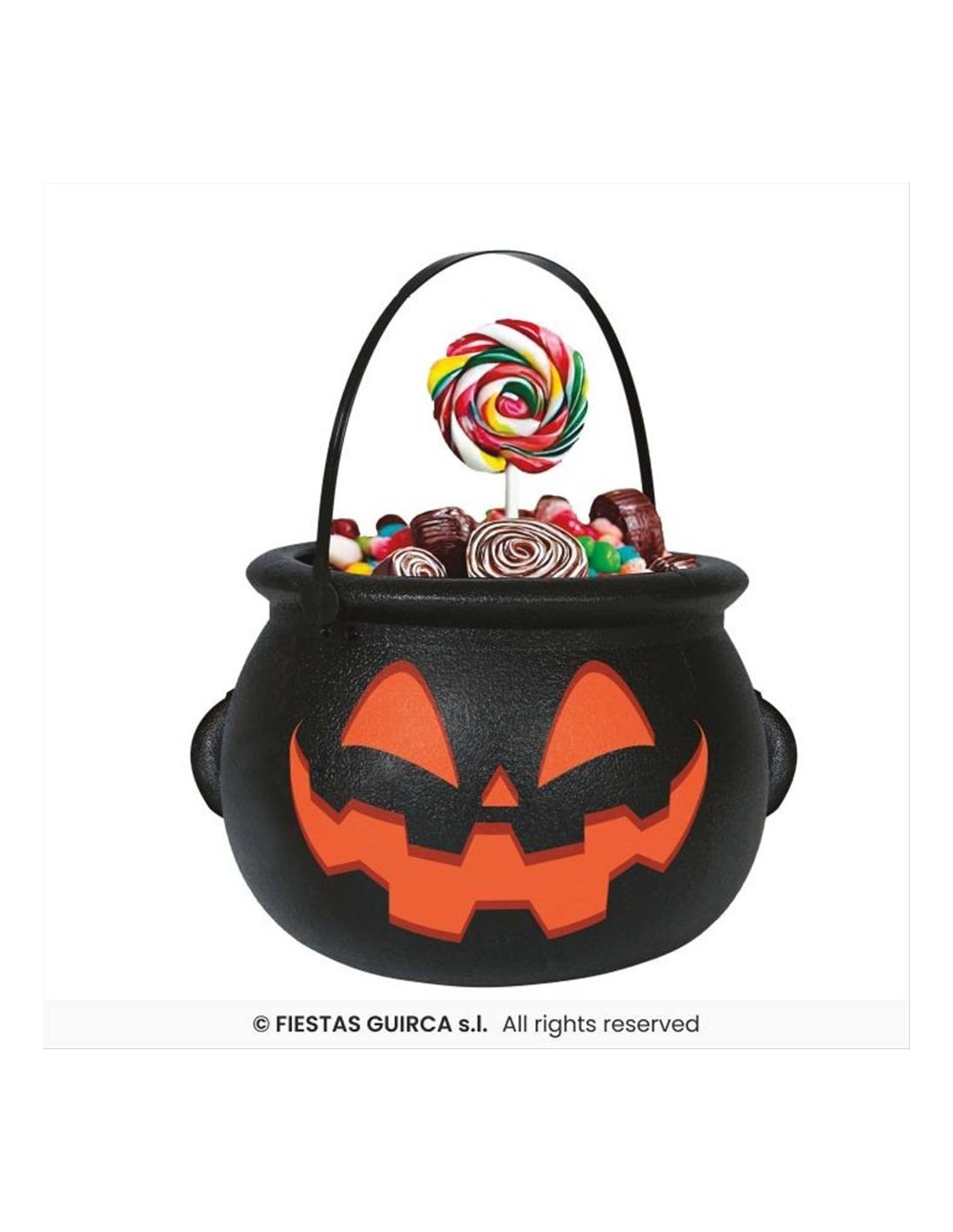 Dove bolle la magia? Nel Cestino Calderone con Zucca 16x20cm, ovviamente! 🧙♀️✨ Realizzato in PVC resistente, questo divertente accessorio combina il fascino misterioso del calderone nero con la simpatia della zucca arancione più iconica di Halloween 🎃