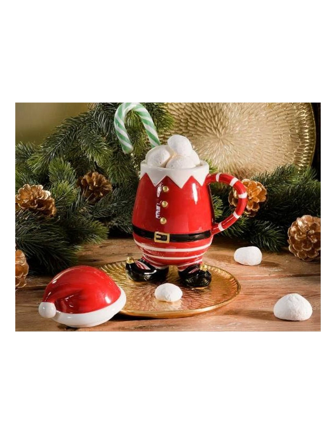 Un capolavoro di design festoso, questa tazza raffigura Babbo Natale con abito rosso e dettagli in oro, e un coperchio a forma di cappello che mantiene le bevande calde e aggiunge un irresistibile tocco decorativo.