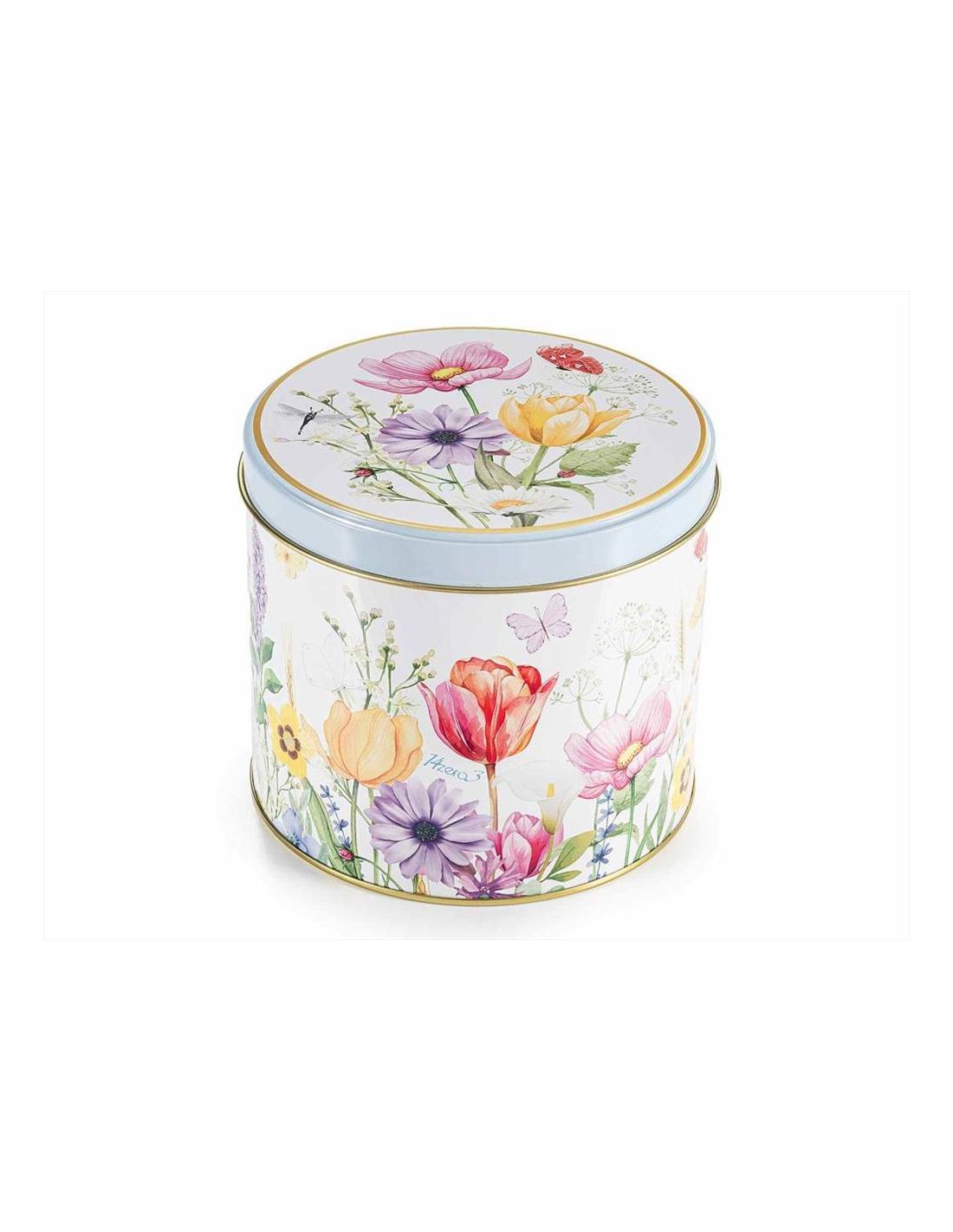 La scatola in latta decorata (Ø 13 x 11,5 cm H) non è solo una confezione regalo elegante: può essere riutilizzata come zuccheriera o contenitore per piccoli oggetti, aggiungendo praticità e stile alla tua cucina.