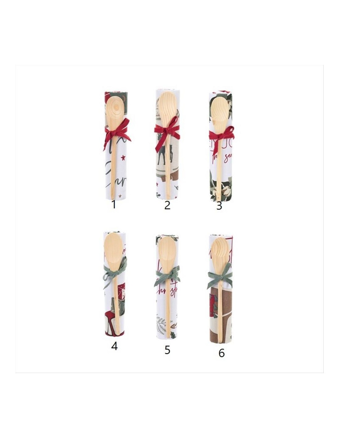 Ogni set comprende uno strofinaccio in tessuto (40x70 cm) decorato con motivi natalizi allegri e raffinati, abbinato a un mestolo in legno naturale.