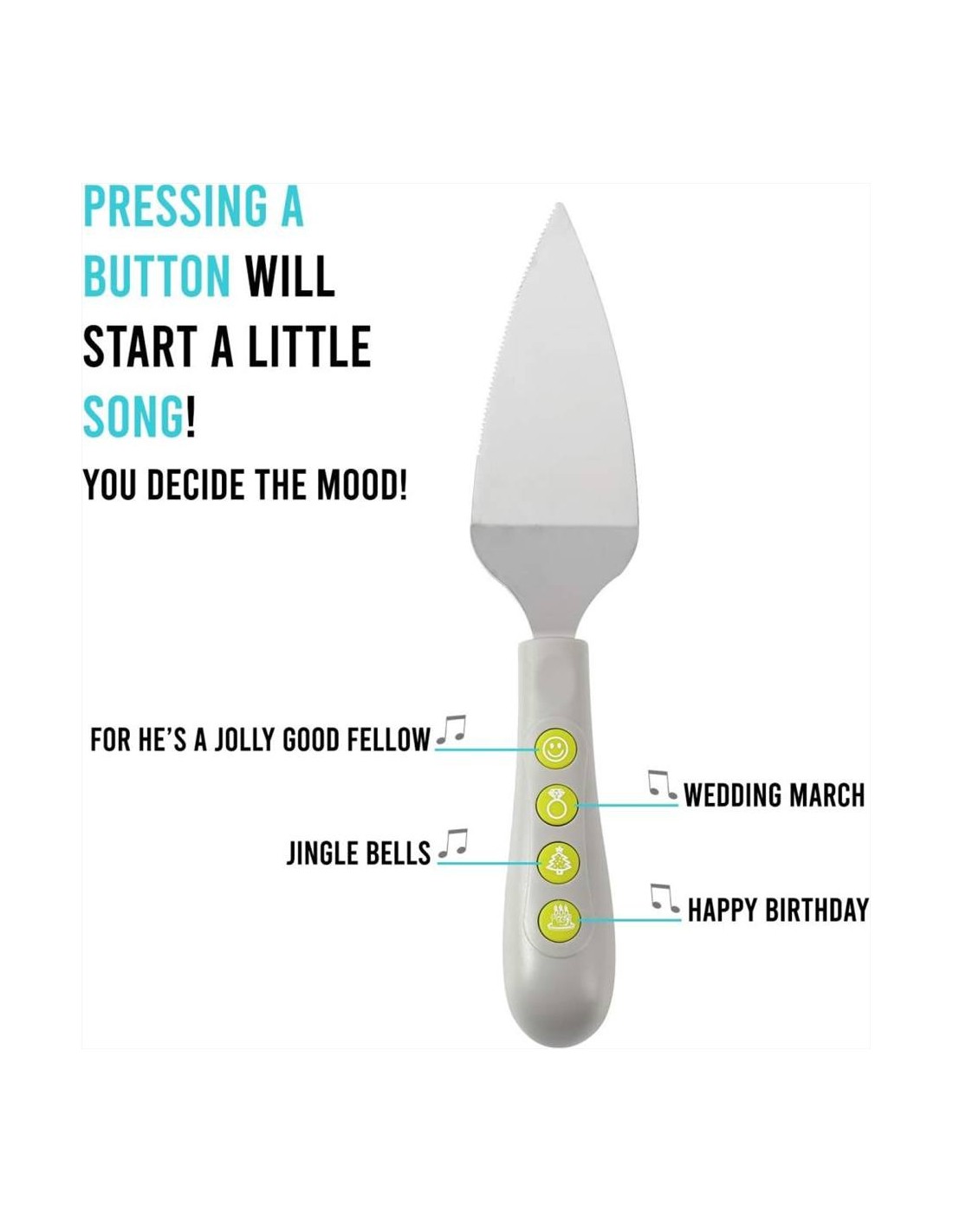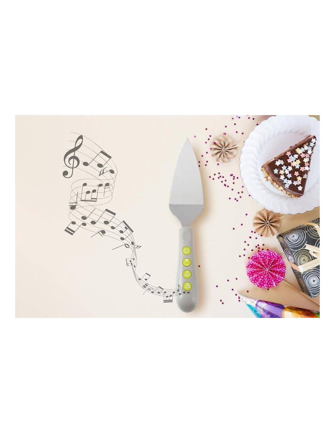 Dotata di bordo seghettato per un taglio preciso, questa paletta originale suona 4 melodie iconiche: "Perché è un bravo ragazzo", "La marcia nuziale", "Jingle Bells" e "Buon compleanno".