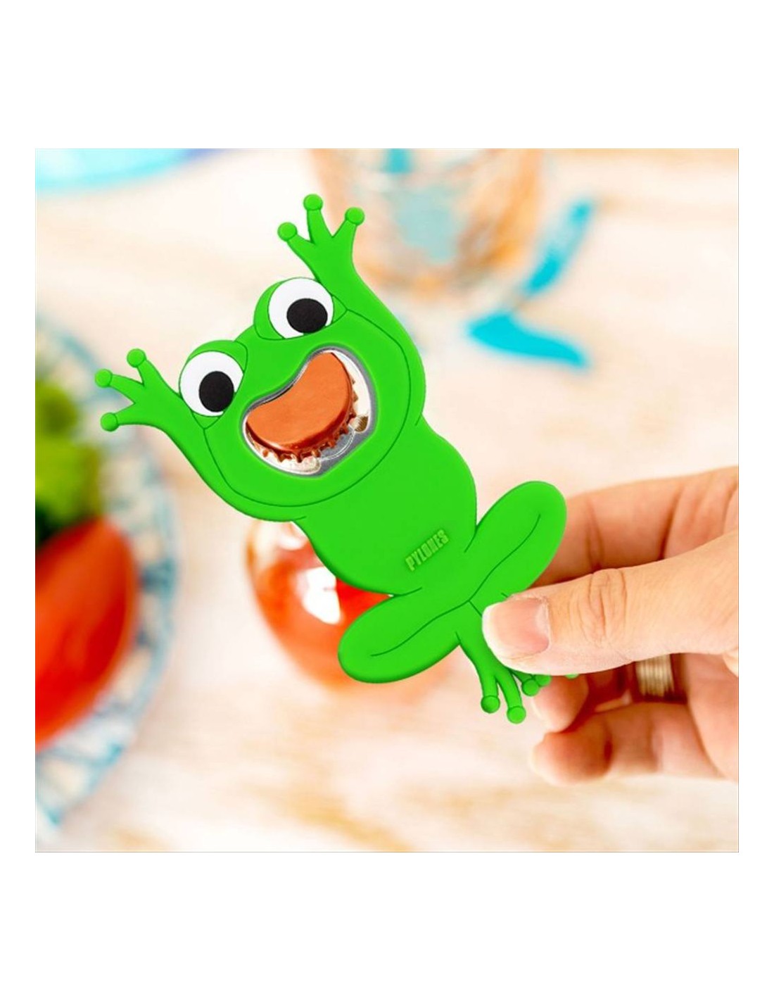 Realizzato in metallo e silicone, è resistente e durevole, perfetto per accompagnarti in tutte le occasioni: cene tra amici, picnic all’aperto, serate in spiaggia o feste improvvisate. La sua forma a rana lo rende immediatamente riconoscibile e aggiunge un tocco di ironia alla tavola.